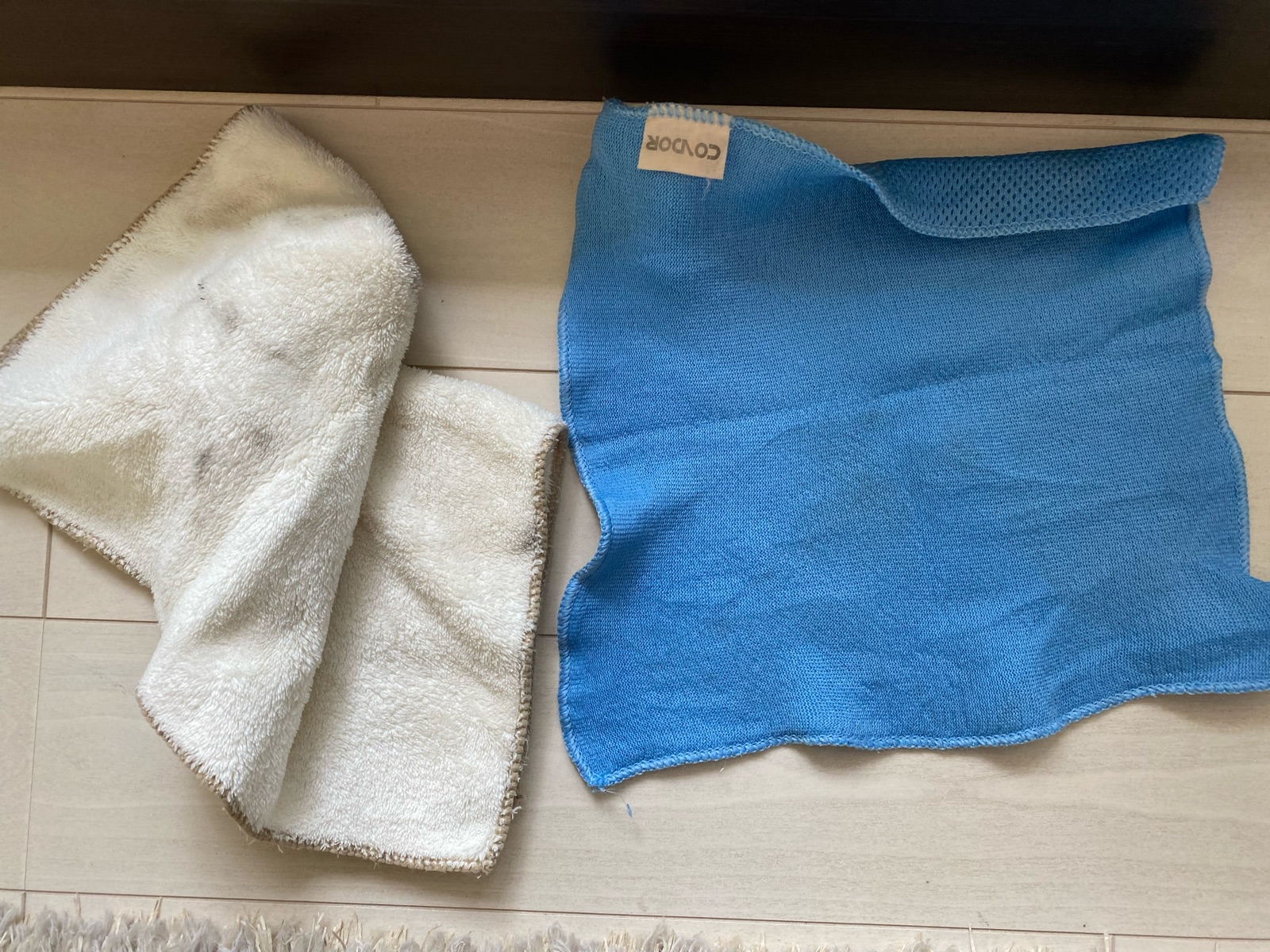水に濡らして固く絞った雑巾(右)と乾いた柔らかい雑巾(左)を両手に持って