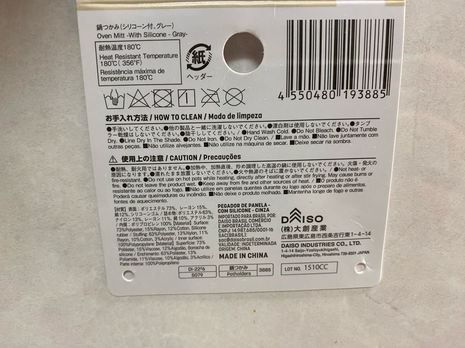 耐熱温度が記載されていた鍋つかみをダイソーで発見したので買ってきました♪