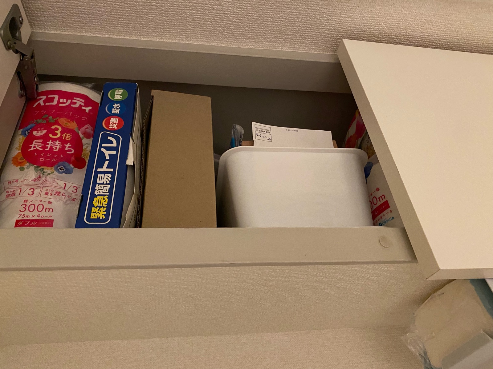 トイレットペーパーの芯が直ぐに取り出せれば良いけど、何かあった時用で掃除道具ケースに