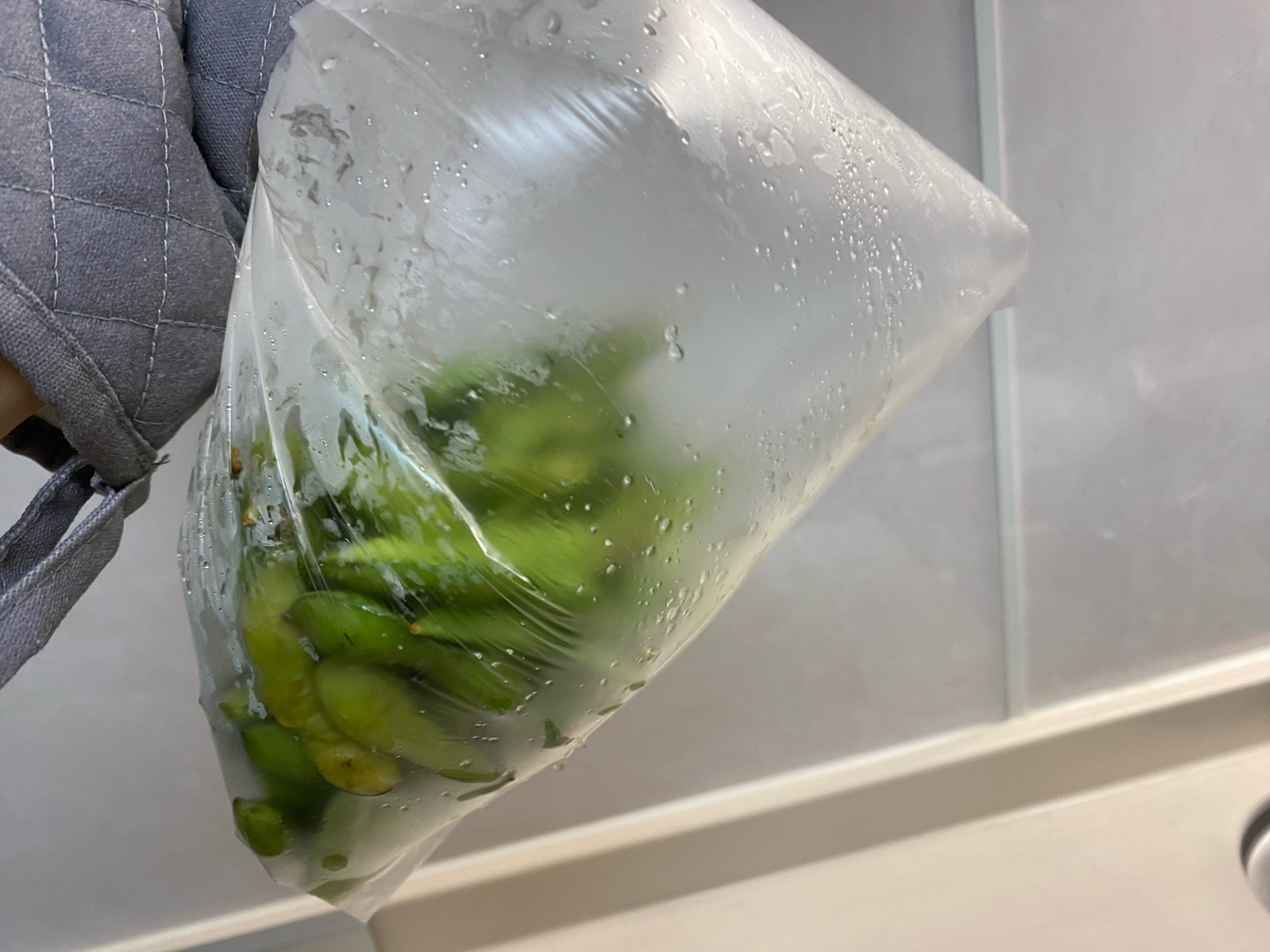 袋を閉じて上下に動かして、塩と枝豆をシェイク♪