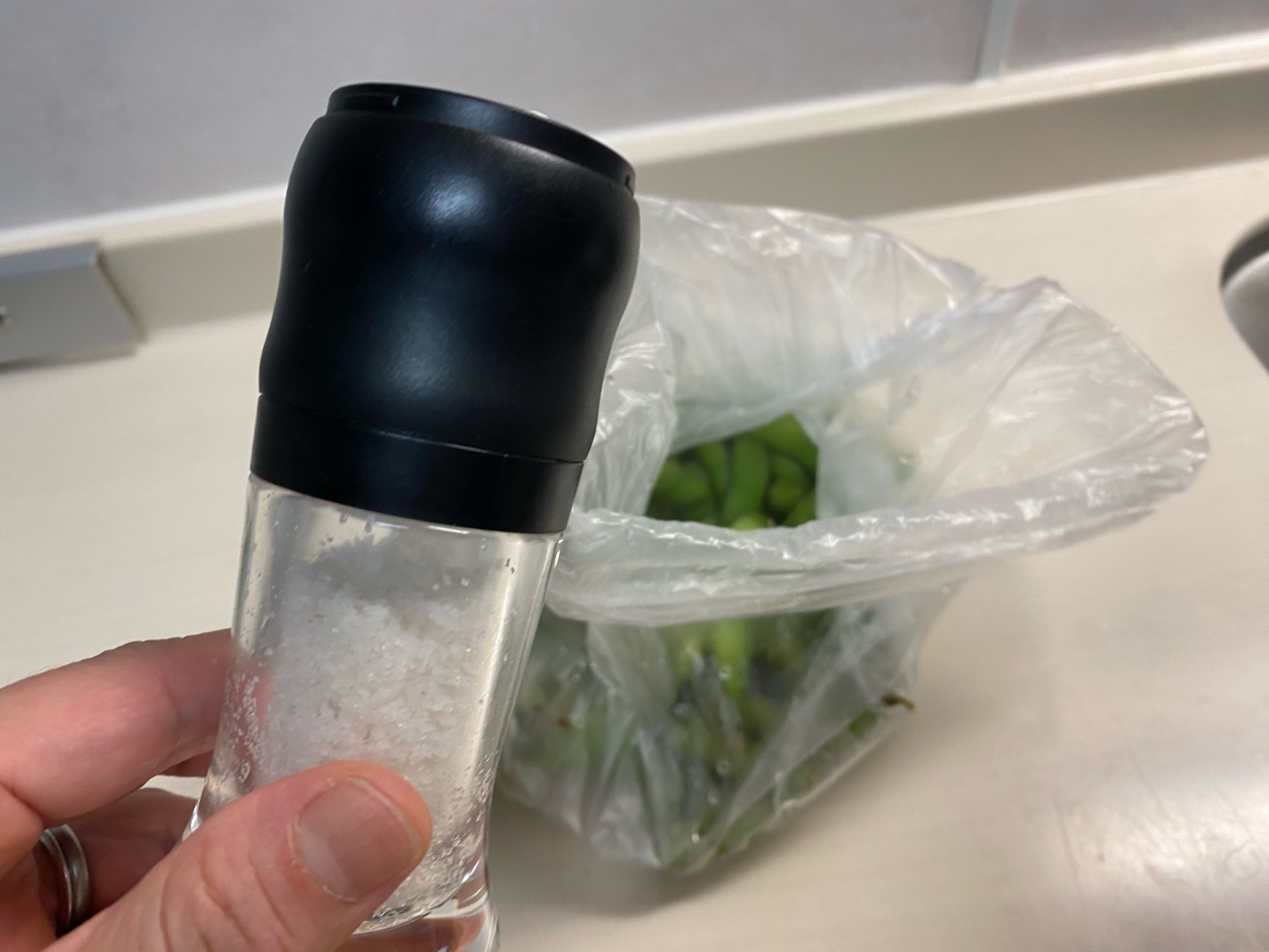 取り出した枝豆に、塩を振り