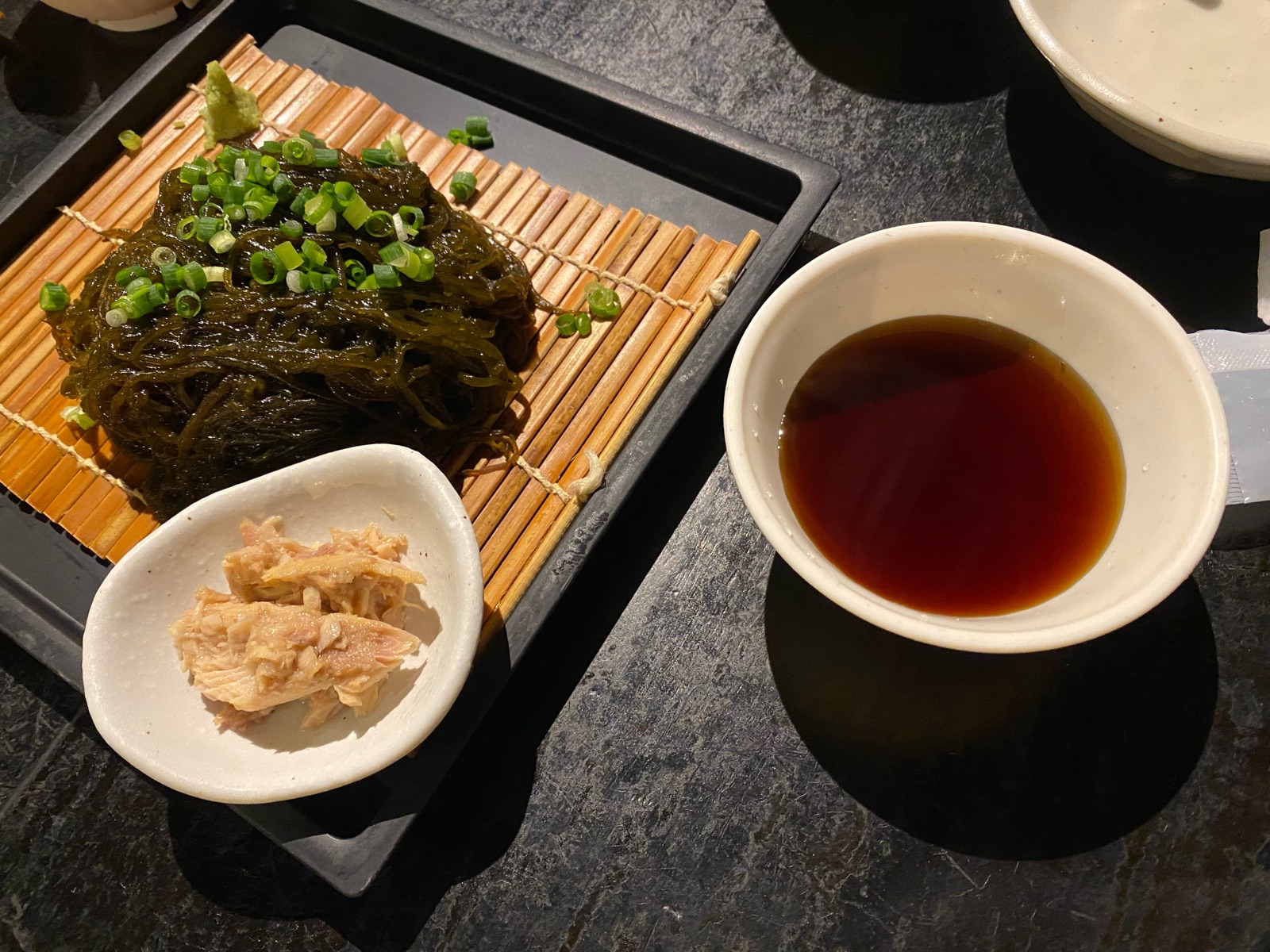 もずくを素麺つゆにつけて、素麺みたいに食べるのですが