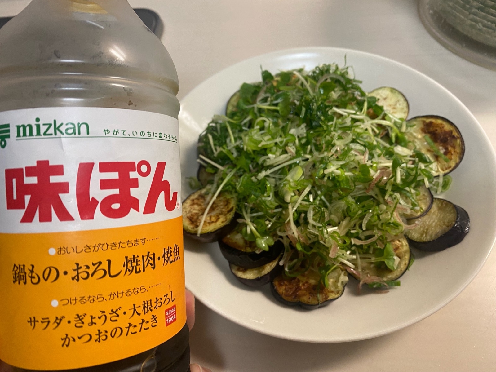 ポン酢の酸っぱさを殆ど感じないくらいに、茄子の甘みと薬味がクセになる美味しさ♪