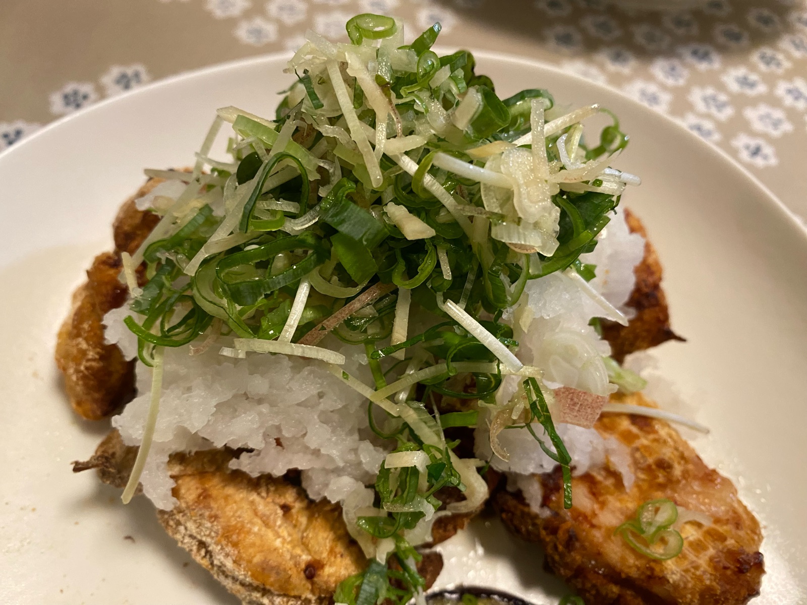 唐揚げや鶏肉・豚肉を焼いた上に大根おろしと「黄金の薬味」に