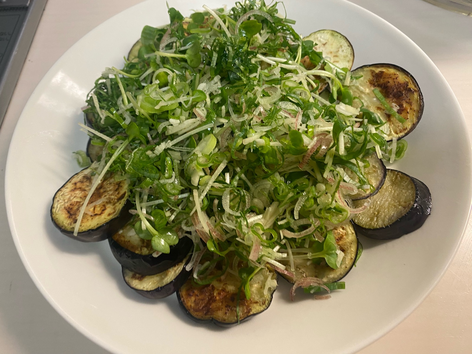 茄子を両面やいて火が通れば、皿に移し薬味をたっぷりのせて