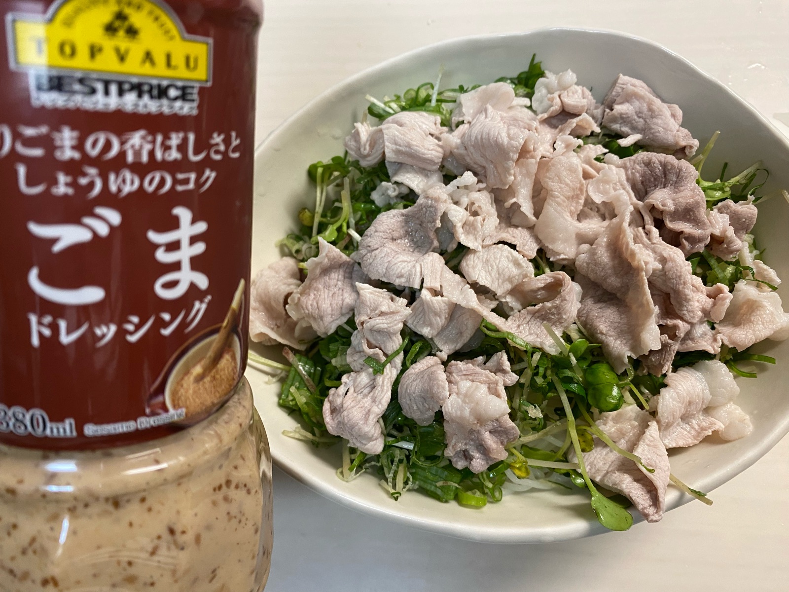 豚しゃぶをのせて、ごまダレ(ごまドレッシング)をかけると