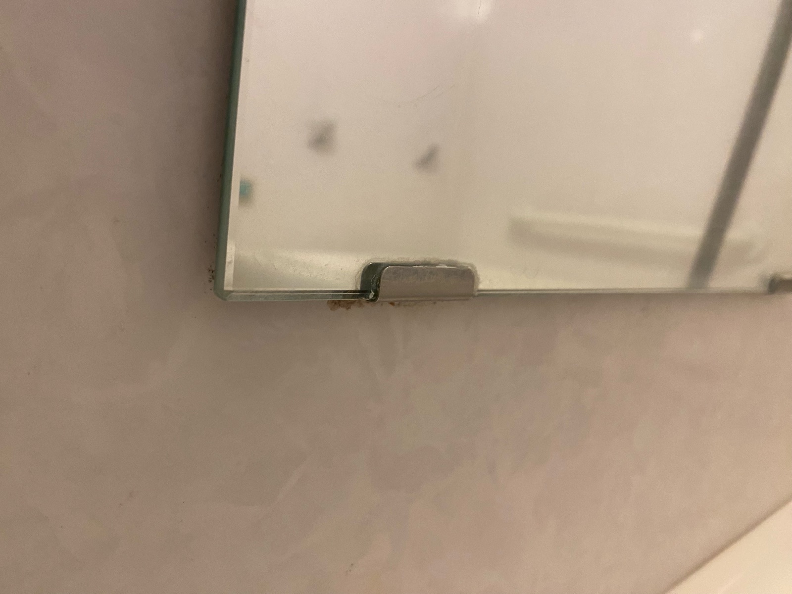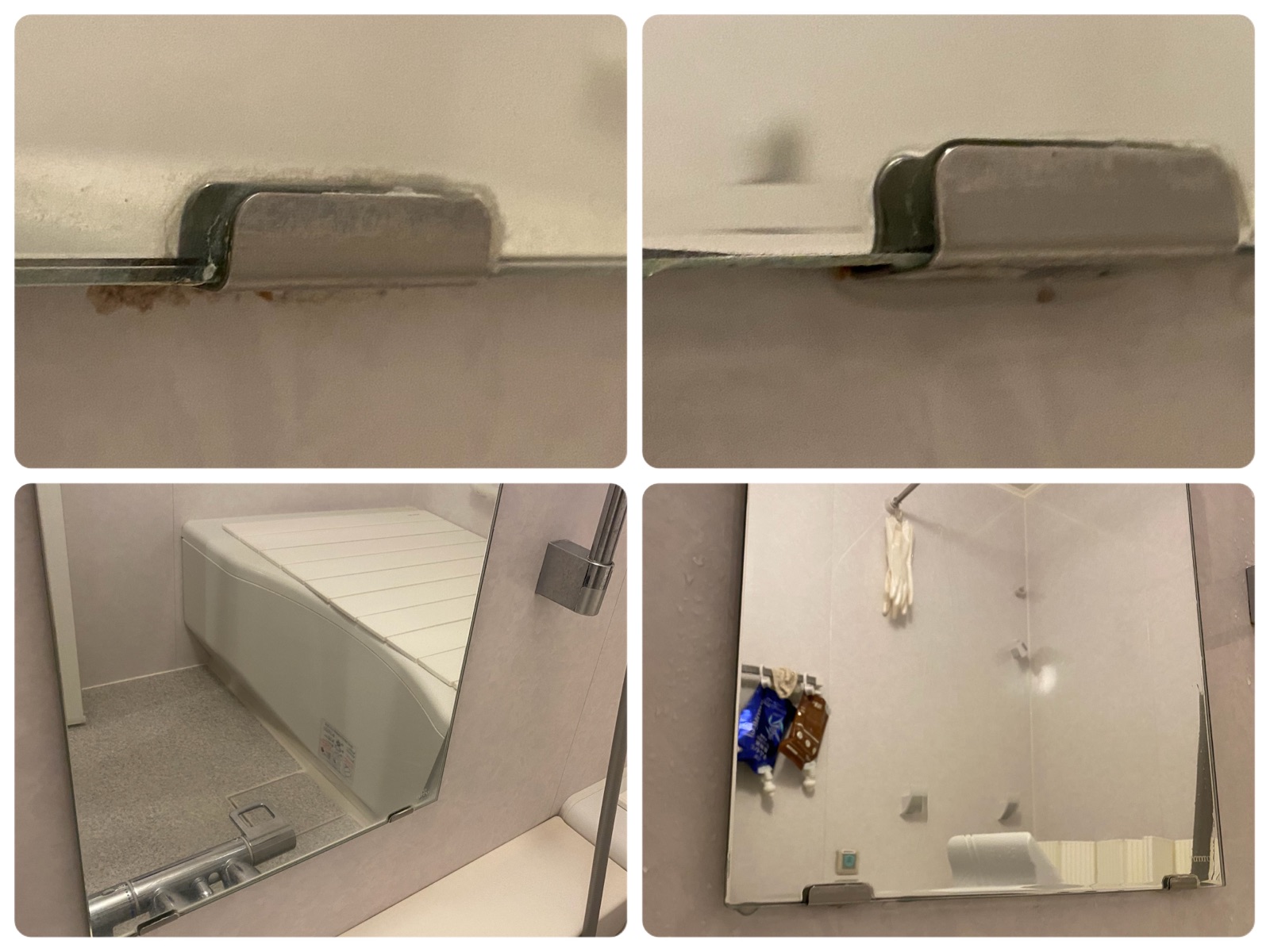 鏡の下の方にウロコ汚れと、鏡を留めている金具周りの汚れ。
