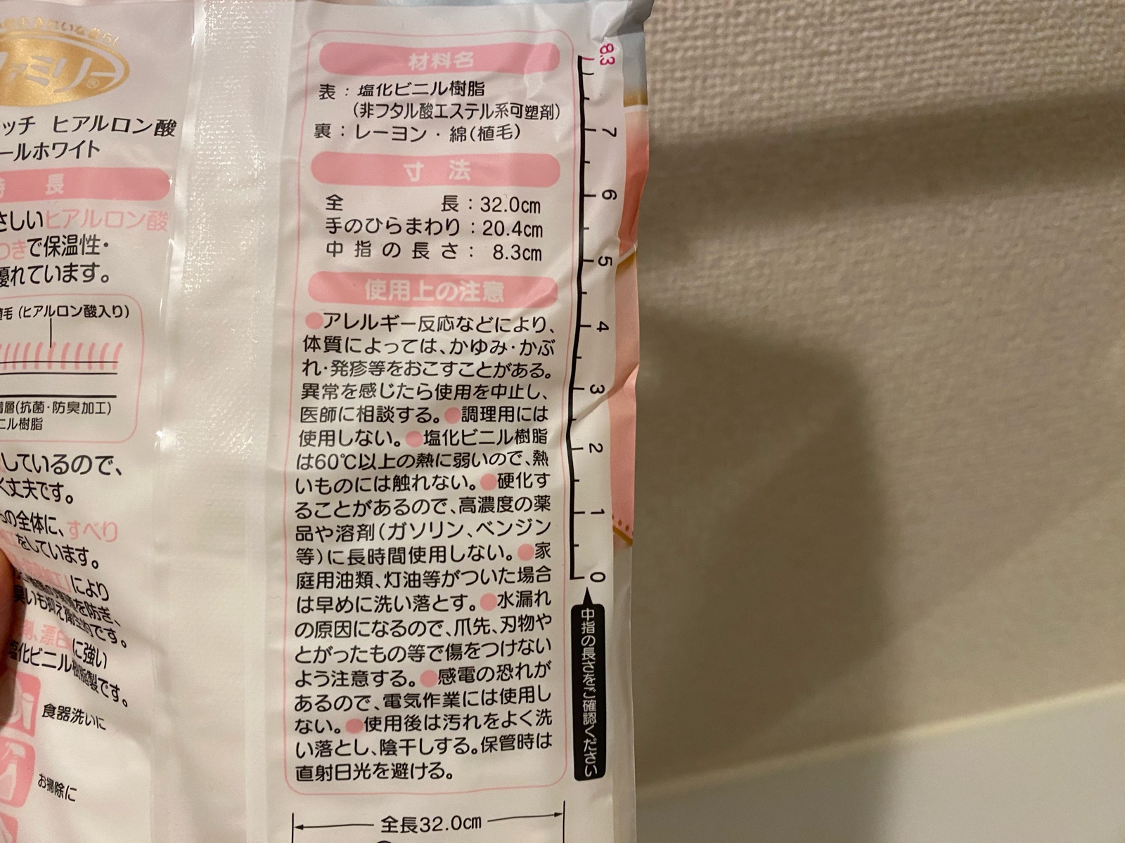 「ファミリー PremiumTouch」ゴム手袋の袋の裏面に、中指の長さでサイズチェックできます。