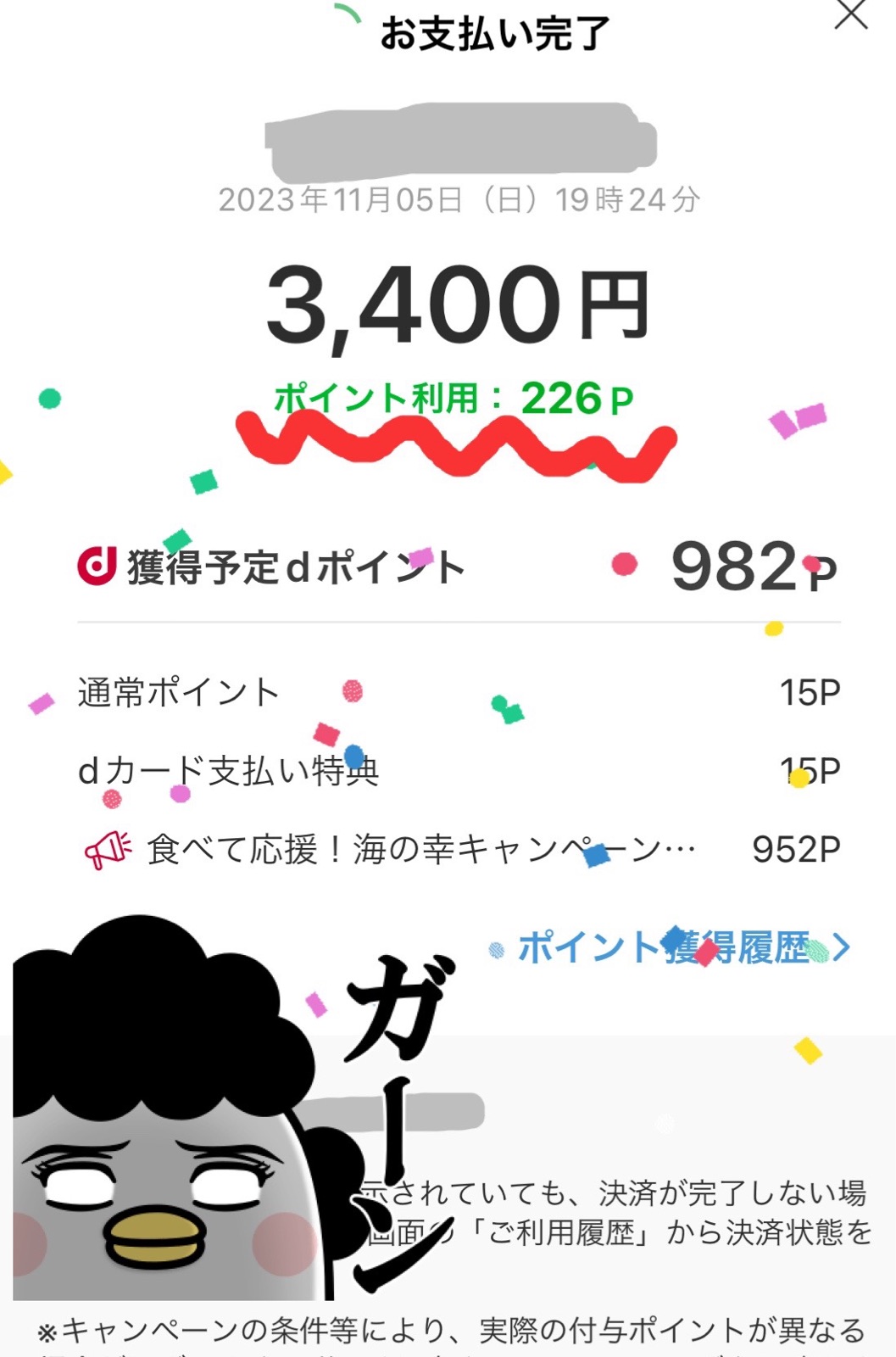 226p利用で、1000p相当の還元が952pとなってしまいました。