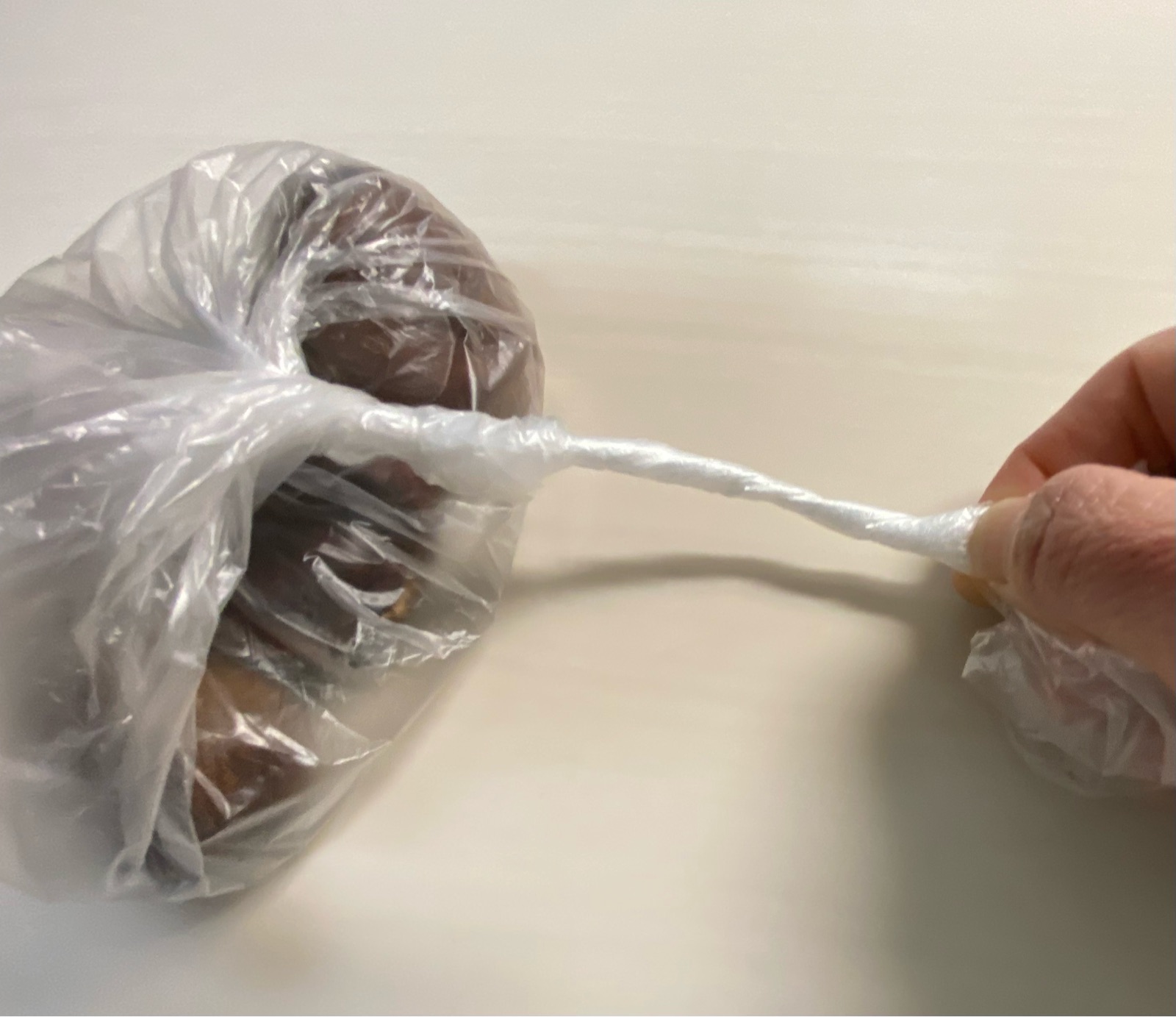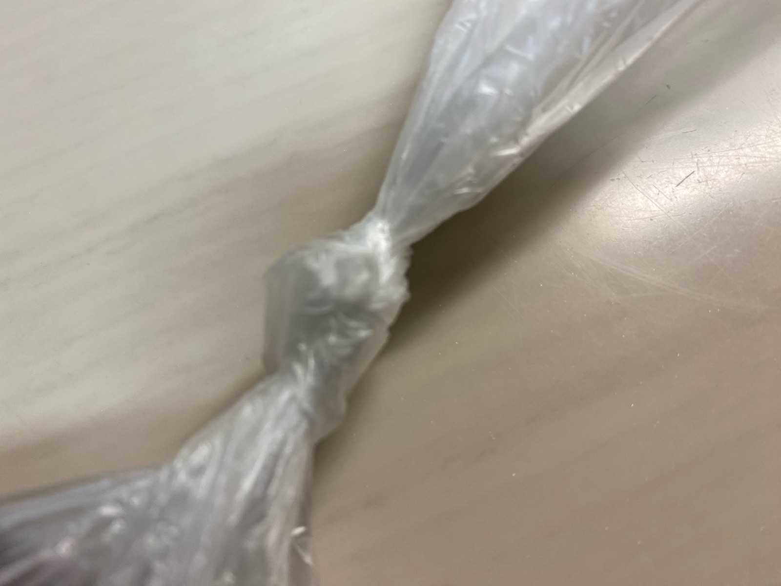 ネジるとビニール袋が固くなるので、結び目に向かってネジりながら押すと