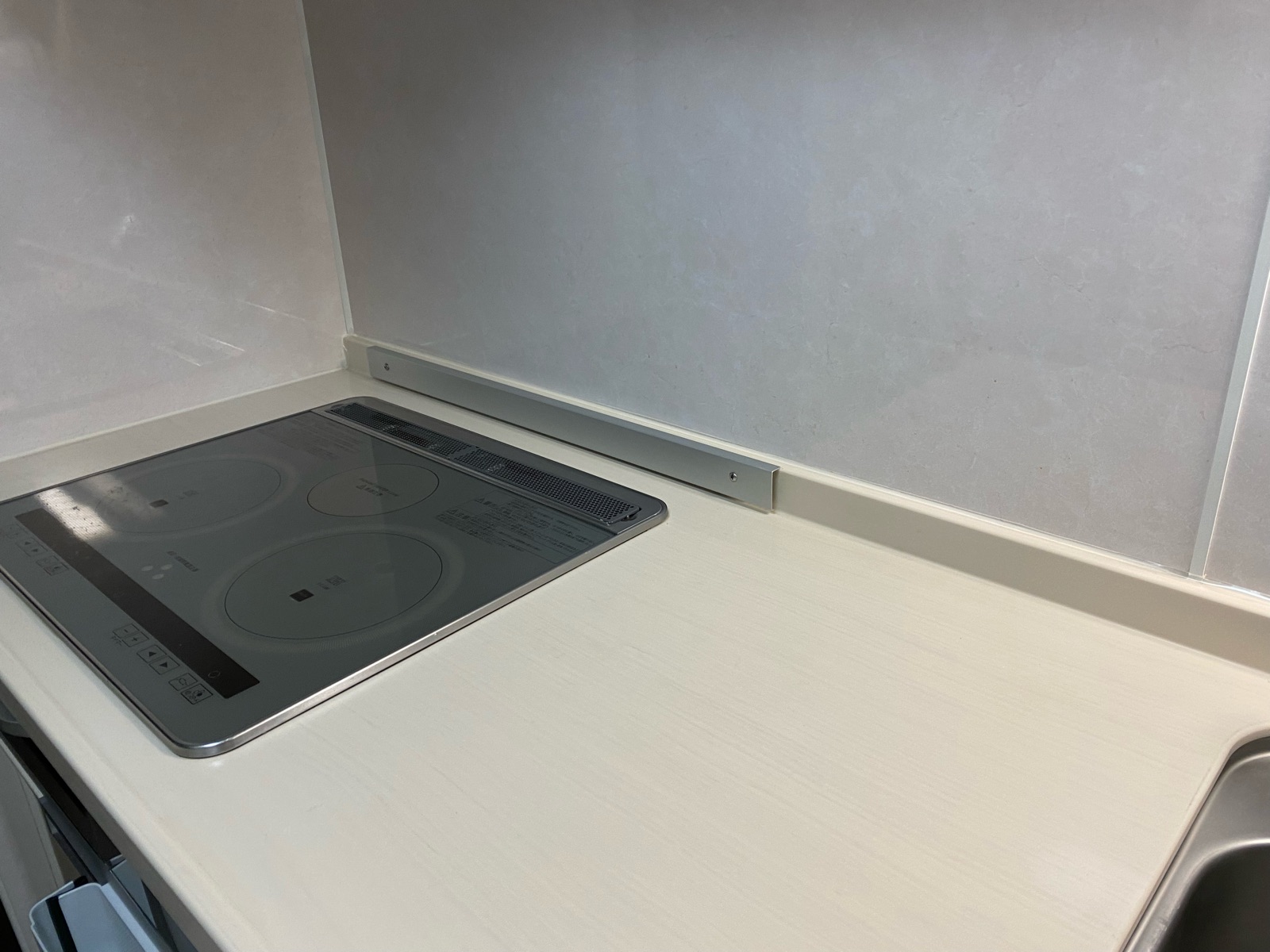 角で一度カットして、コンロ横まで無事に貼り付け完了!!