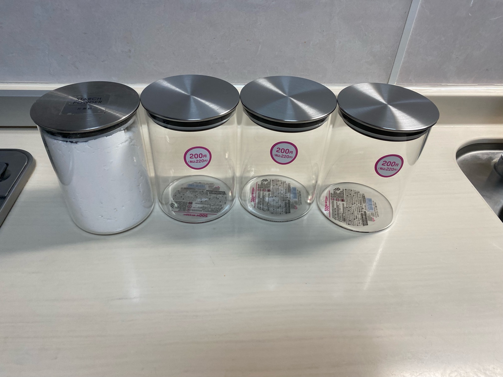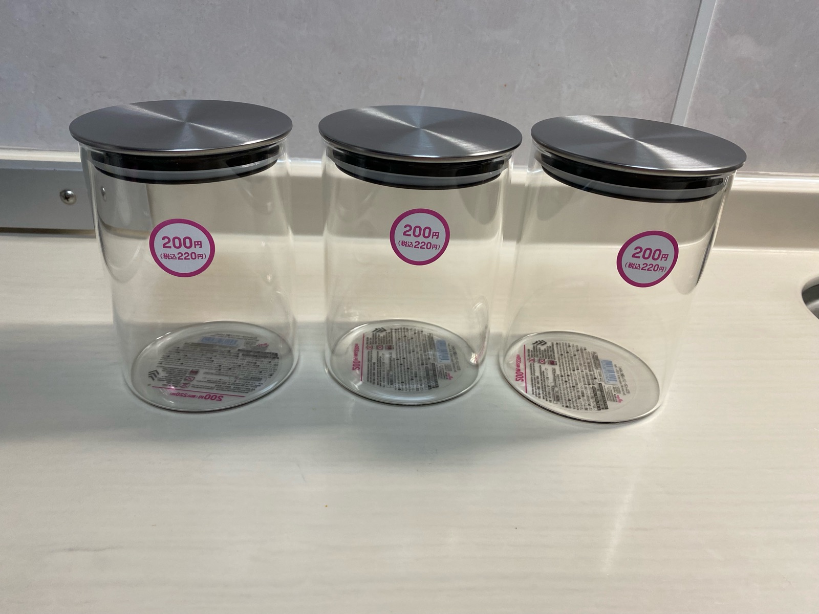 微妙なステンレスの違いがあったのが、左側手前2つ以外は全てダイソーのガラスキャニスターシリーズとなり揃ってきました。