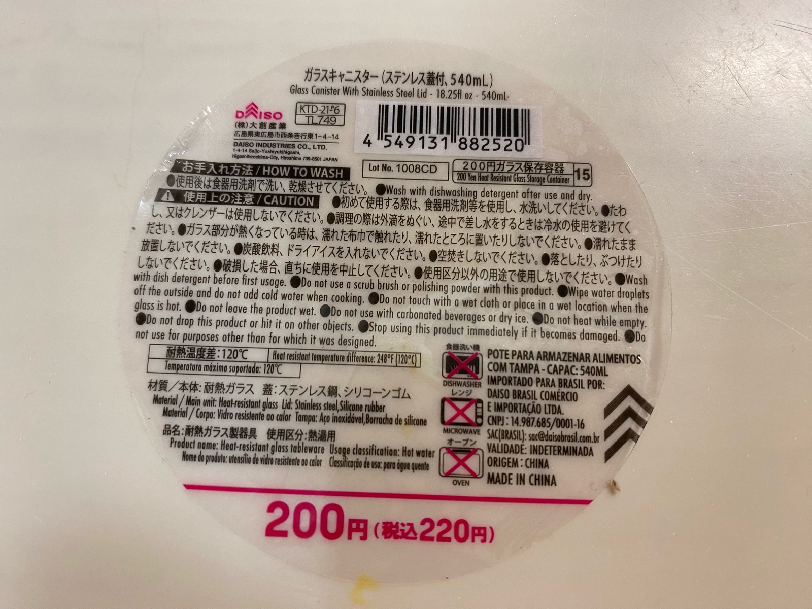 ダイソー ガラスキャニスター ステンレス蓋付 540ml 税込220円