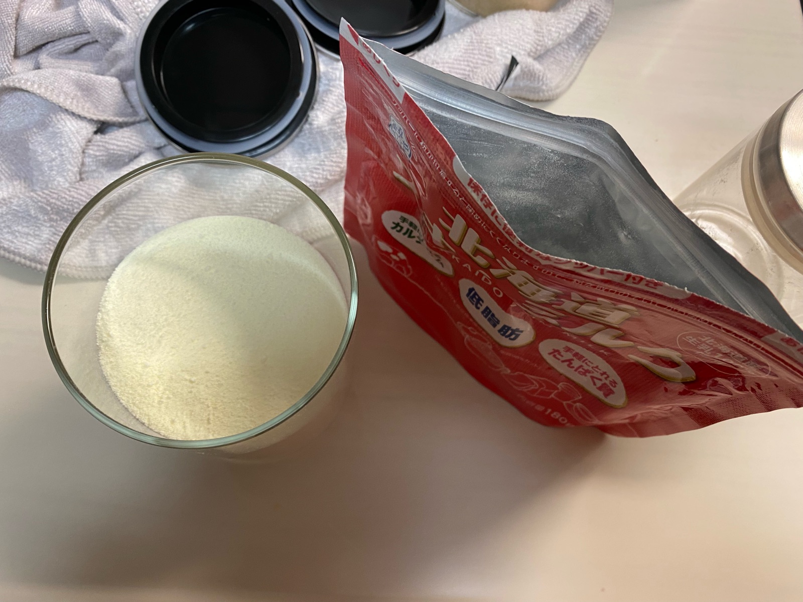 これまで使用していた容器だと、全量が入らず微妙に残っていたスキムミルクを詰め替え。