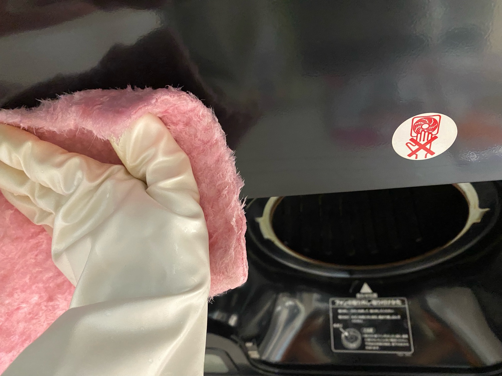 IHの上に置いている交換フィルターの袋が写り込むくらいに、中はキレイなまま!