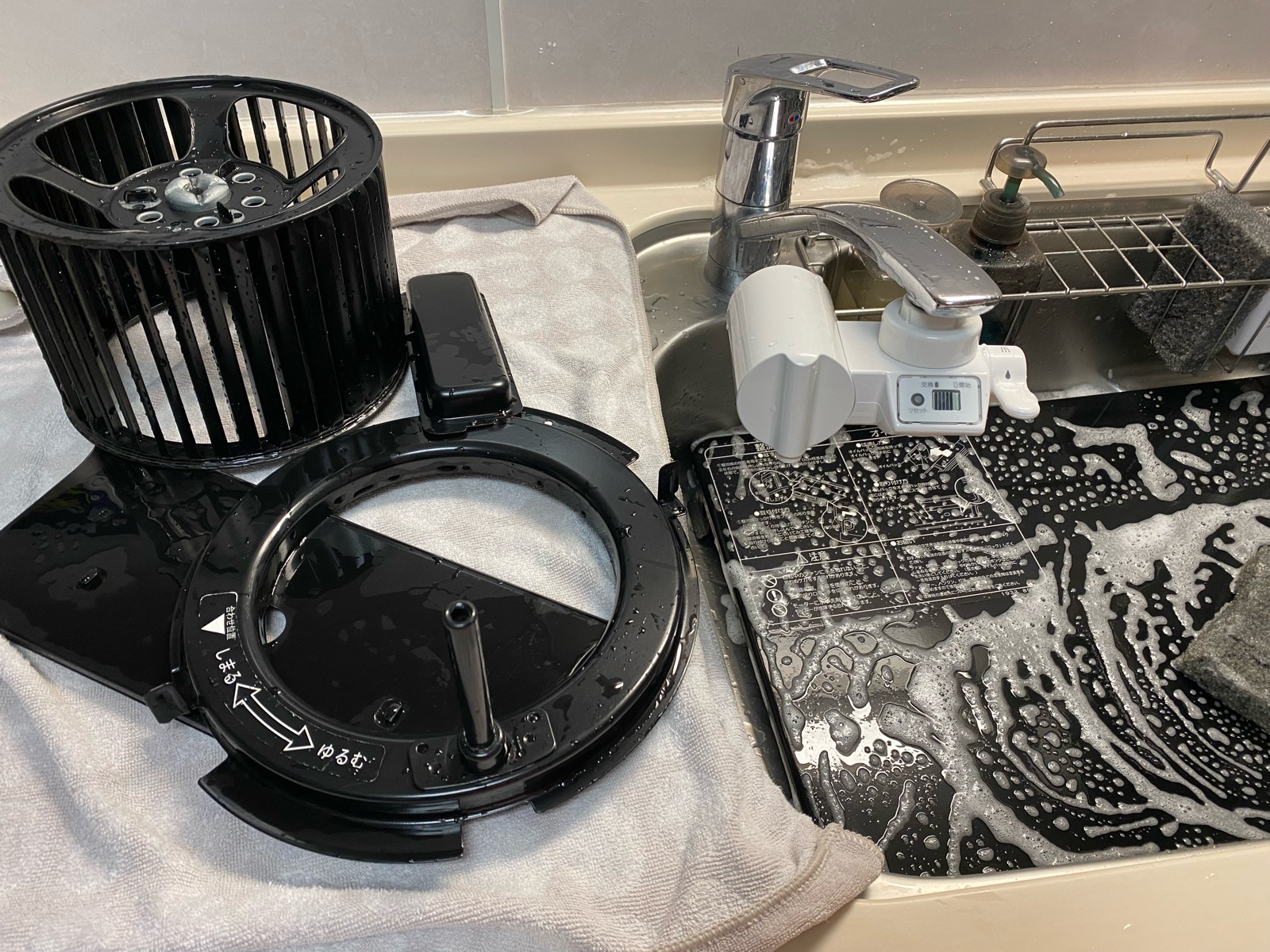 フィルターを取り外し→部品を洗って→掃除→フィルター交換。