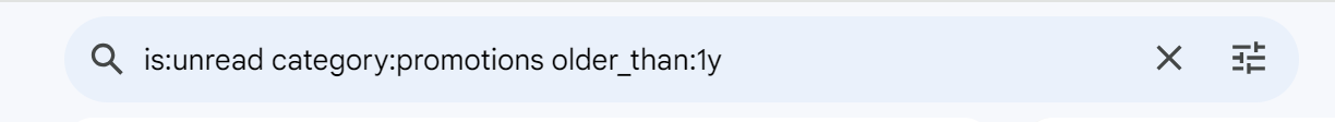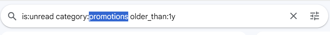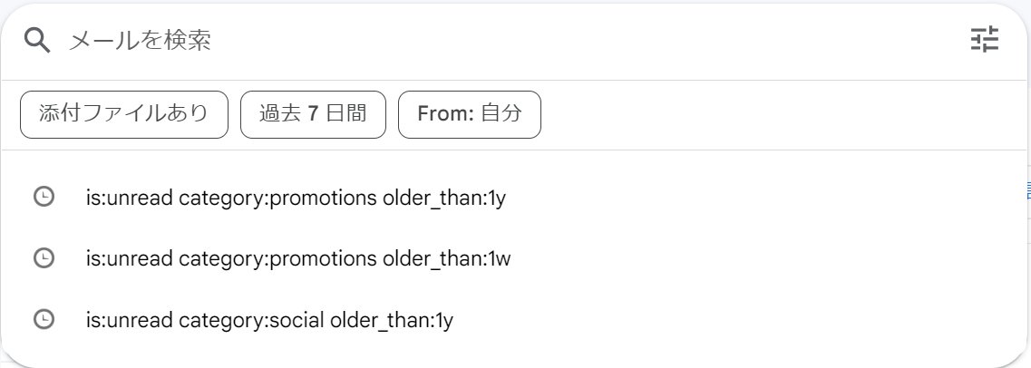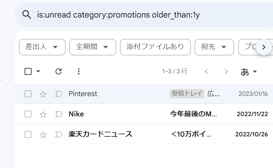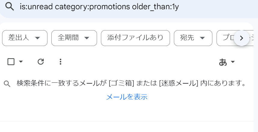 「is:unread category:promotions older_than:1y 」と、入力し検索すると