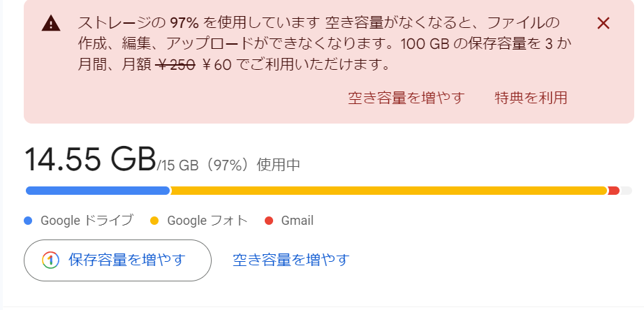 Googleのストレージ。毎日の様に「ストレージが・・」とメールが届いている方も多いのでは?