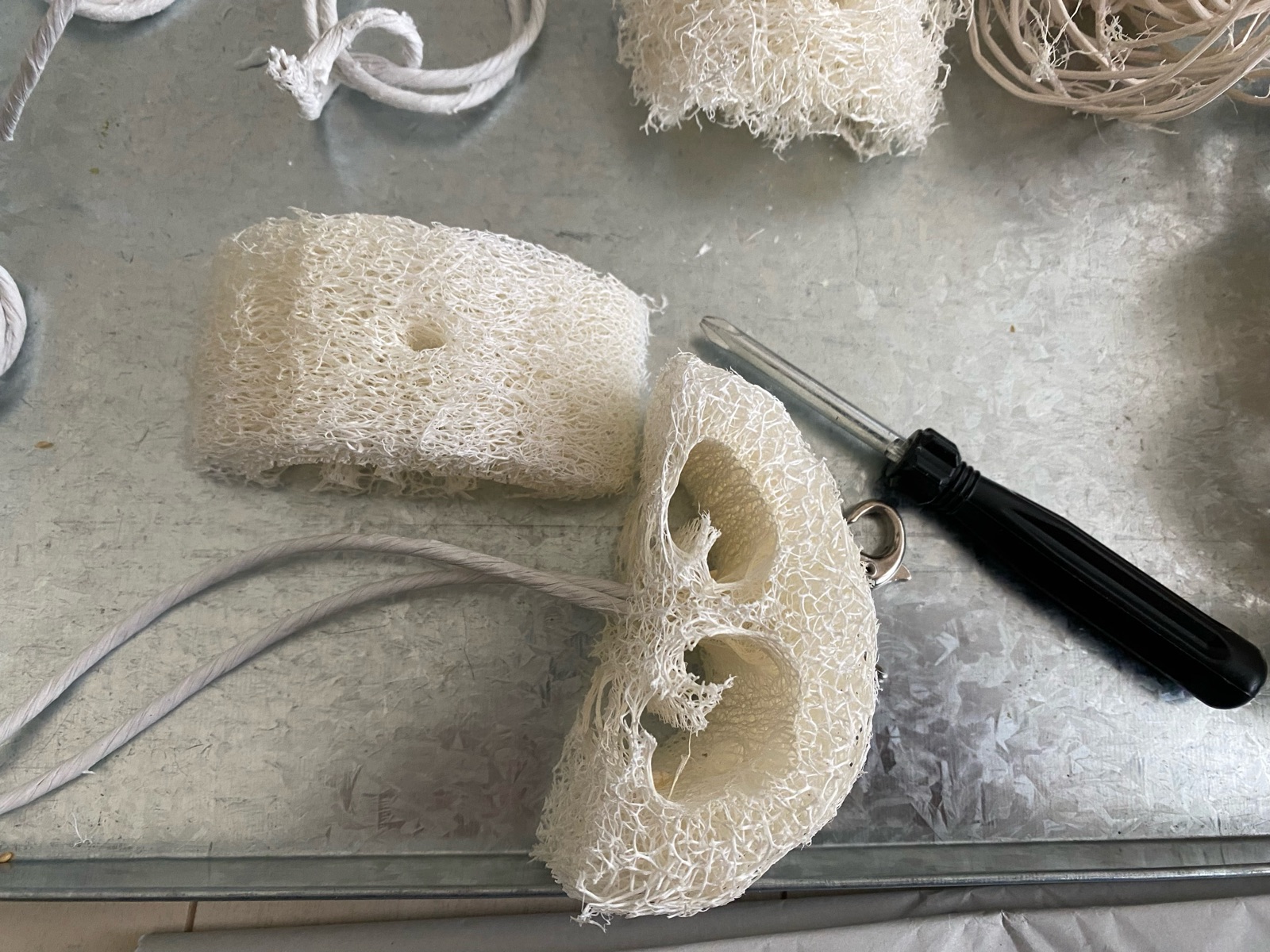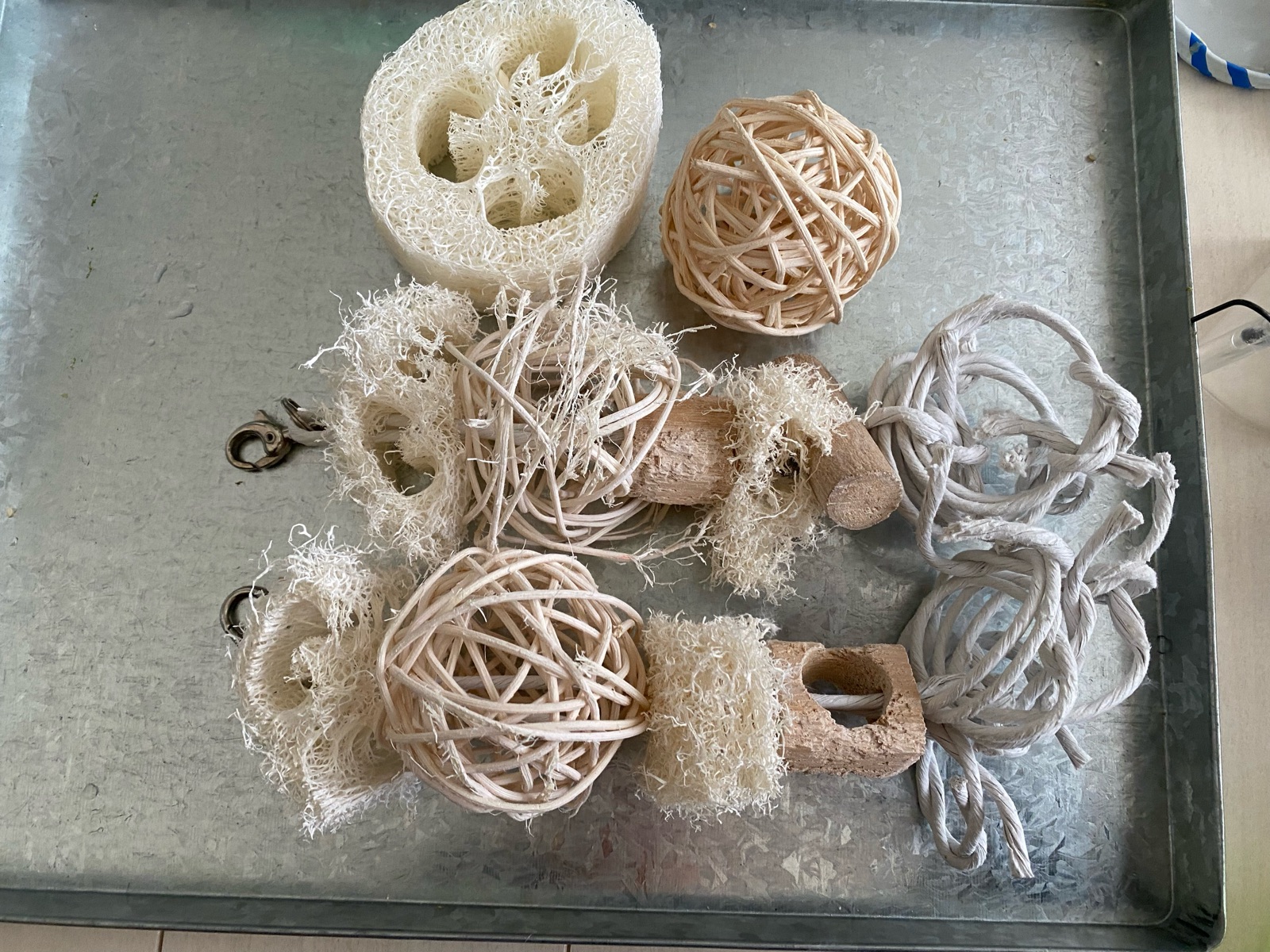 齧るのが好きなので、齧っても大丈夫なペット用のヘチマや木のボールを紙紐で繋げています。