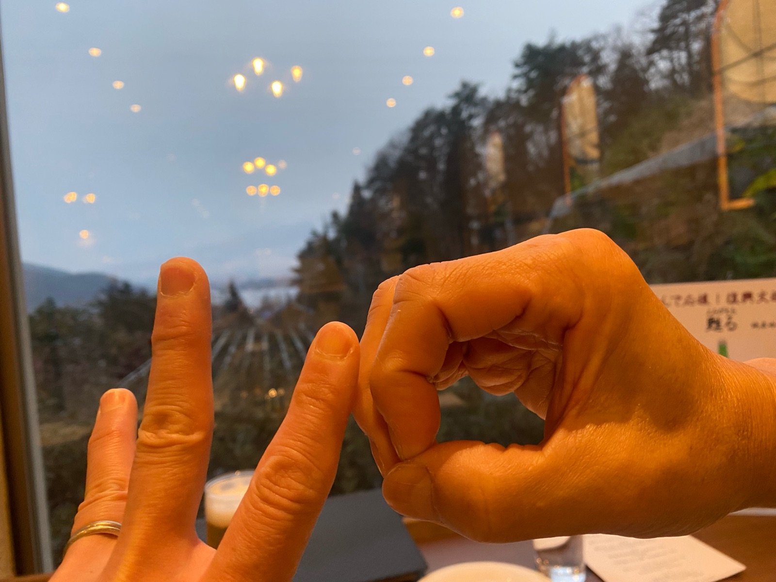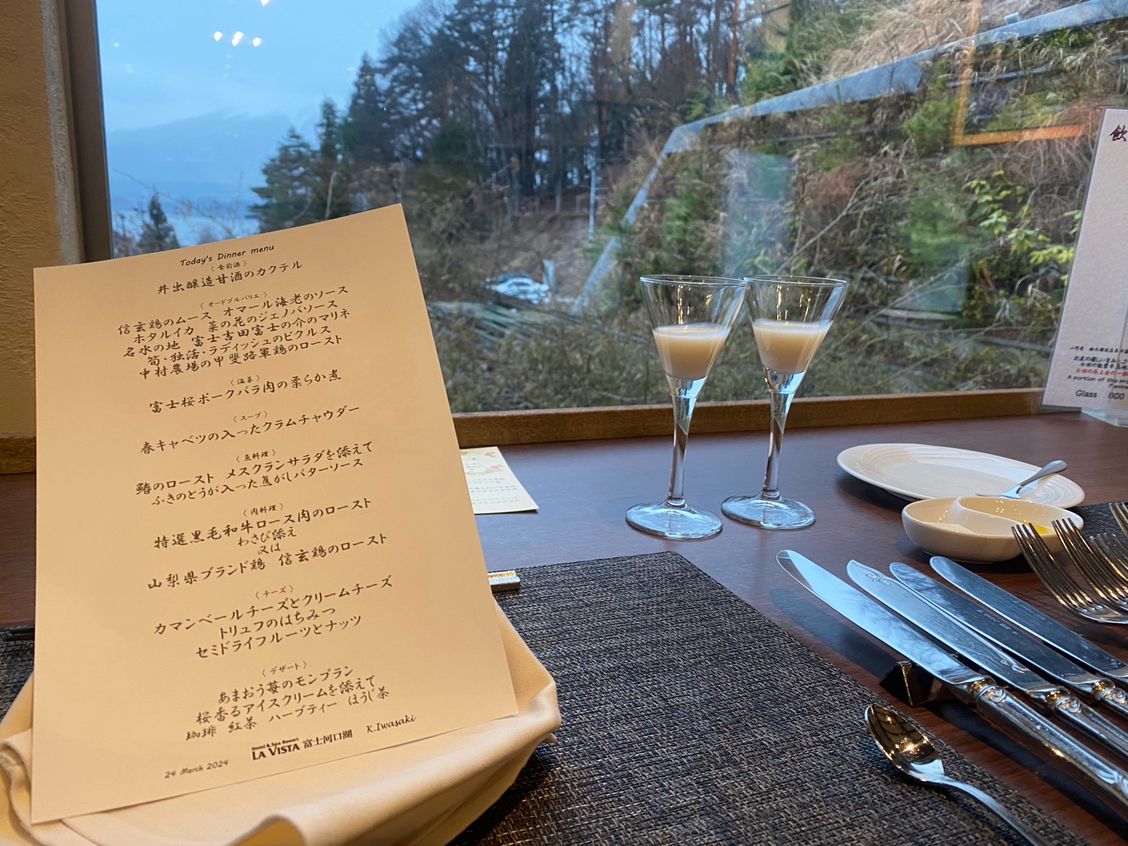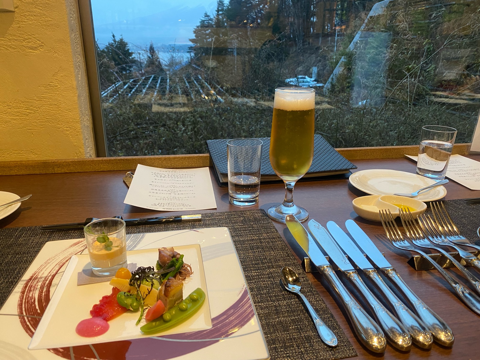 窓際のテーブルで夕暮れの富士山をながめながらディナーの始まり♪