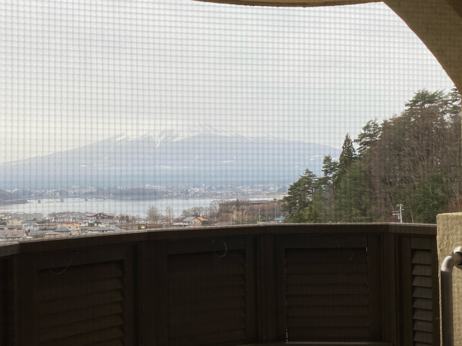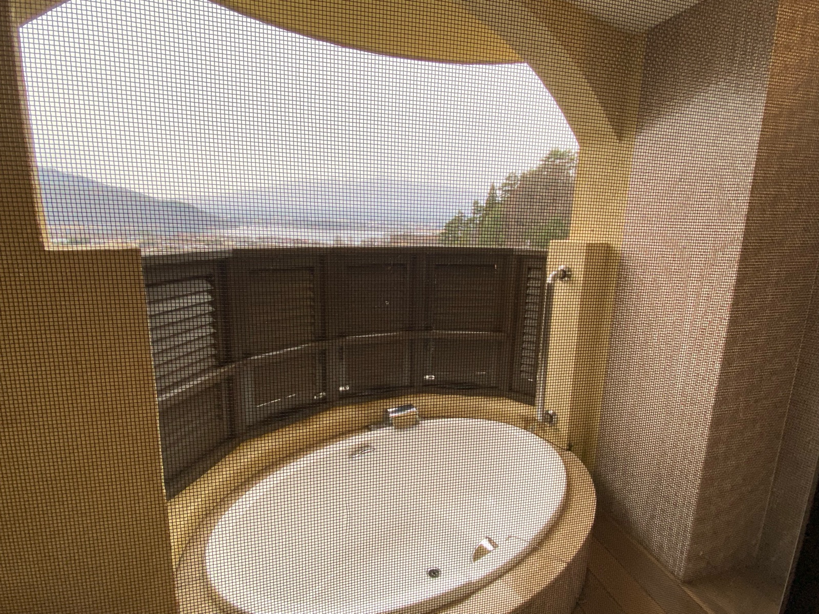網戸越しに部屋の露天風呂を確認。