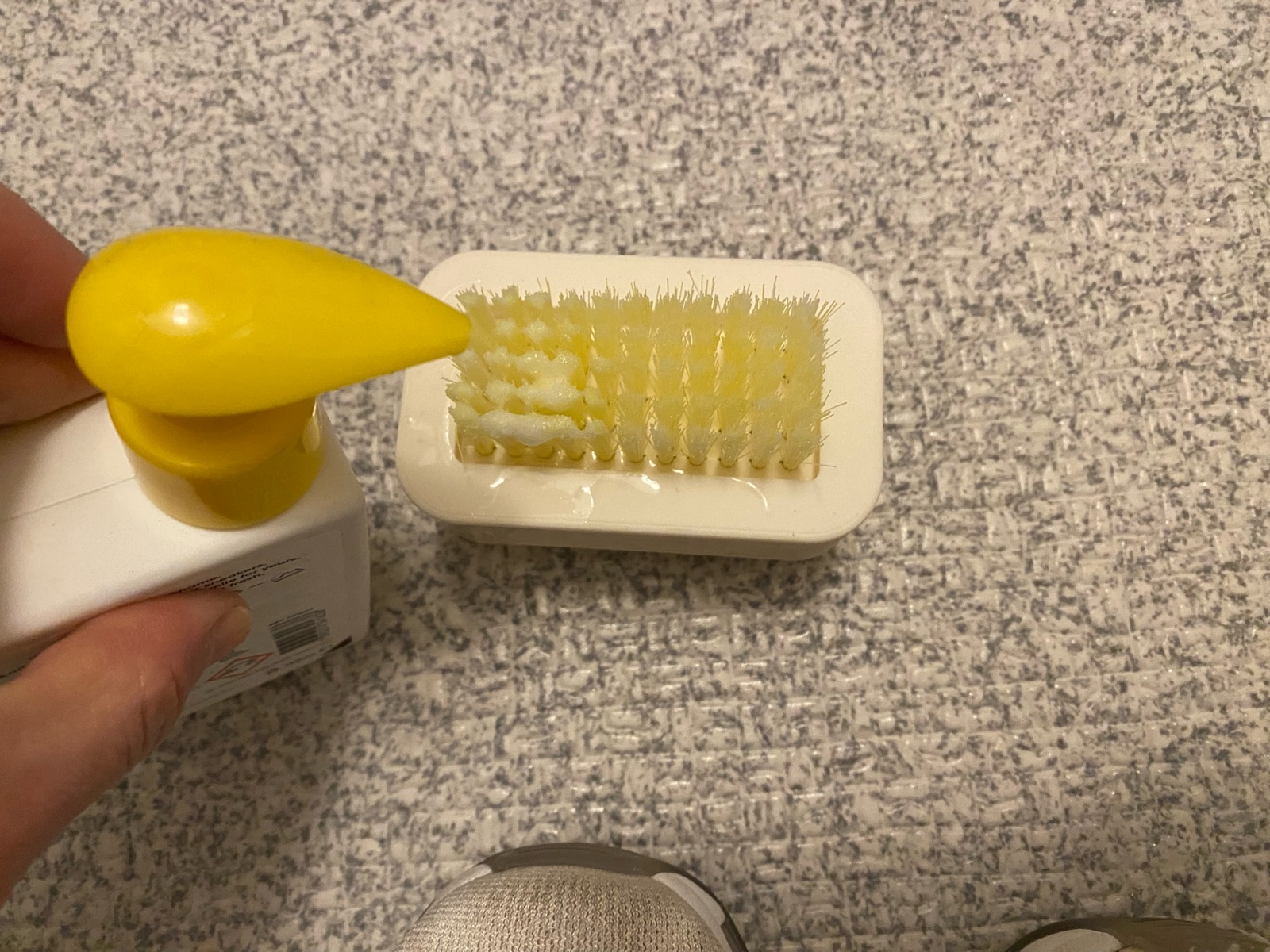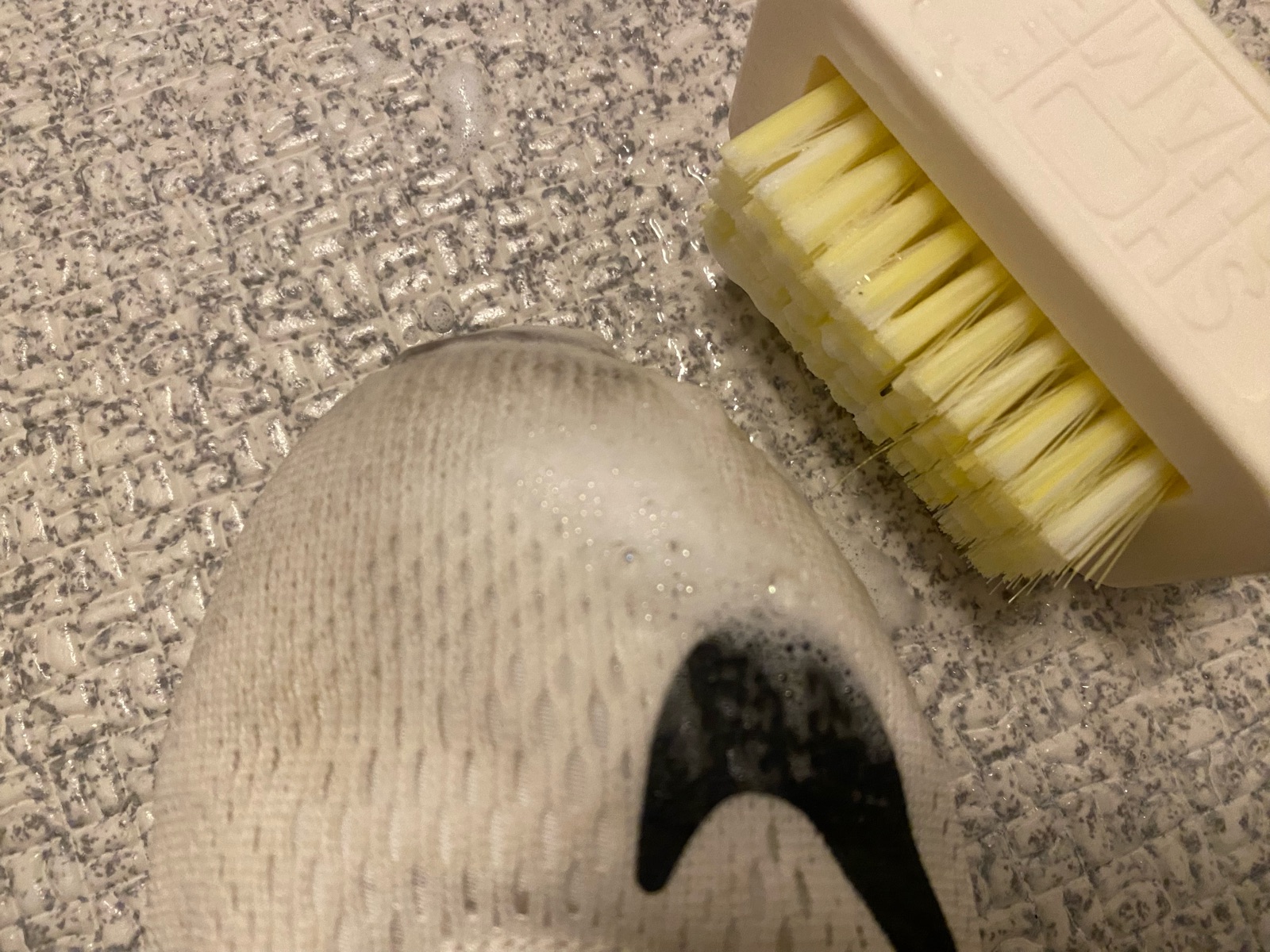 ブラシの硬い方で靴底も同じように擦り洗いして拭き取り