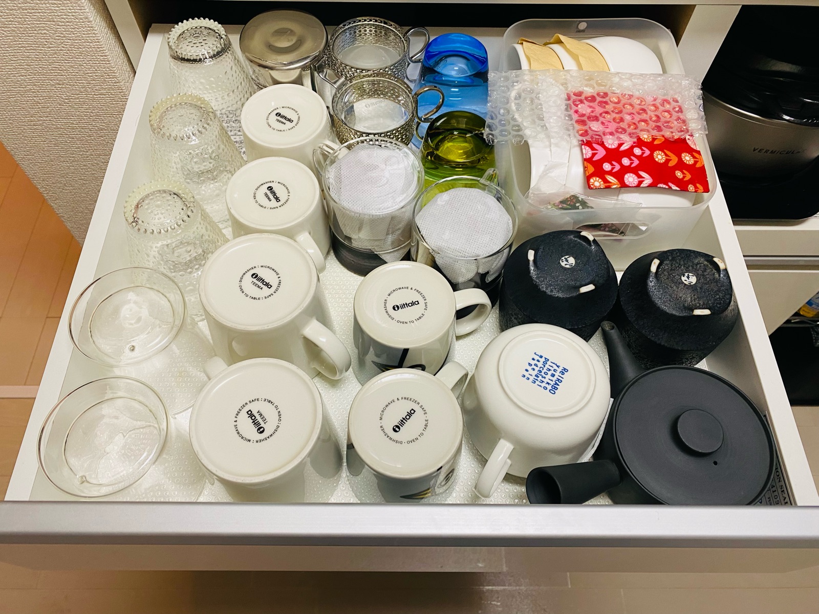 右奥に来客用カップセットをケースごと収納し