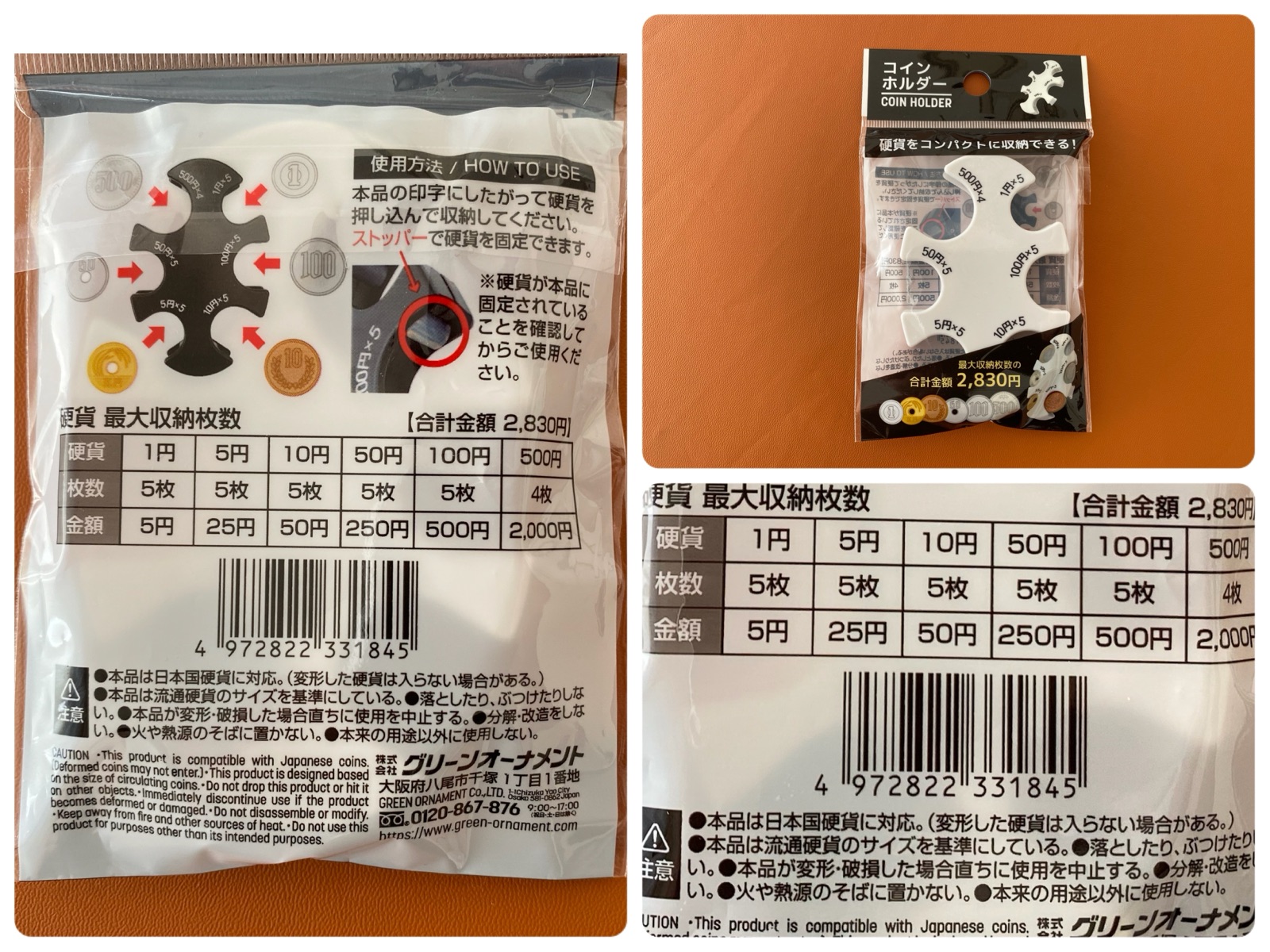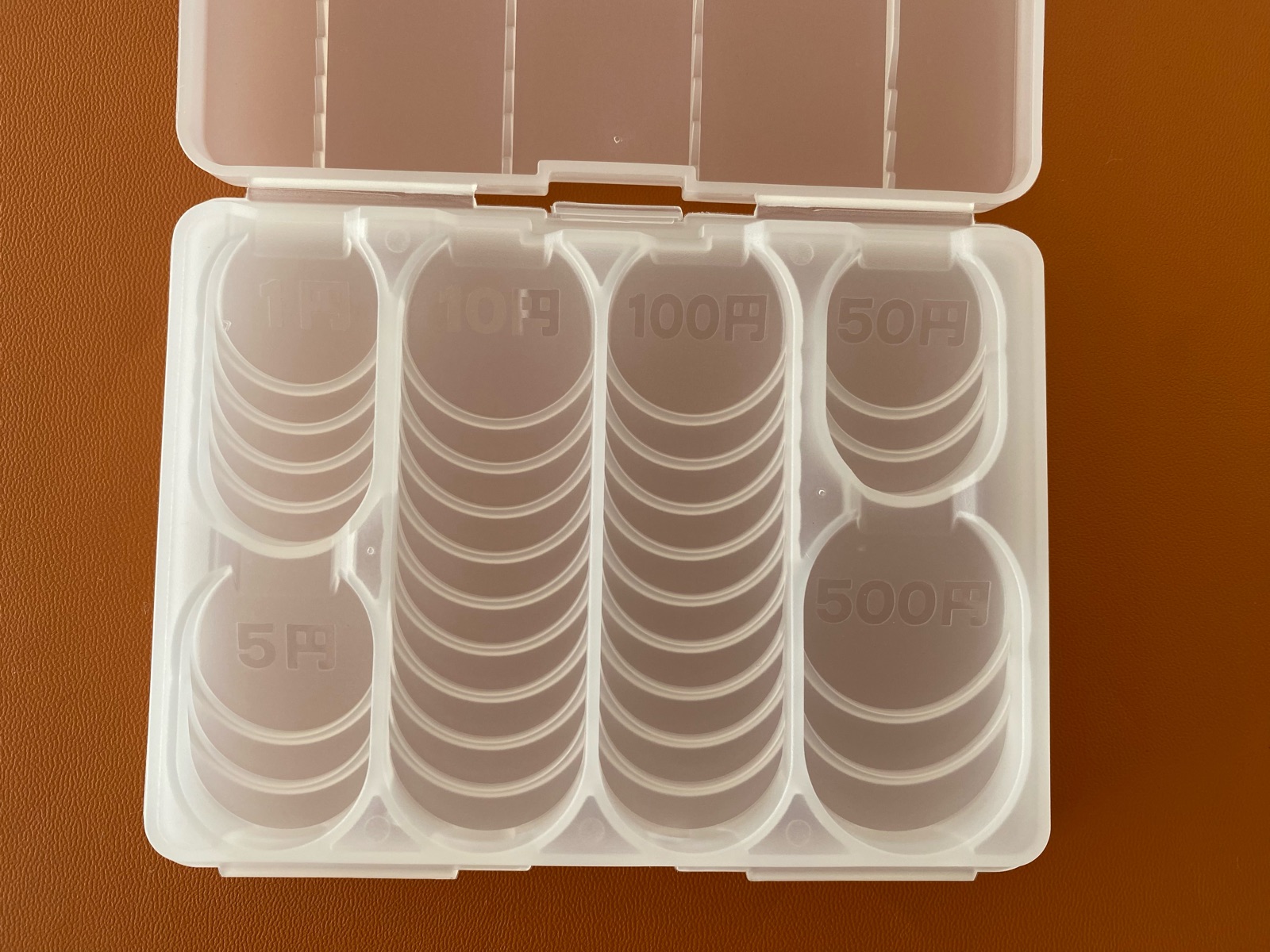 500円硬貨だけが4枚で、他は5枚ずつ収納が可能。全部で2,830円収納できます。