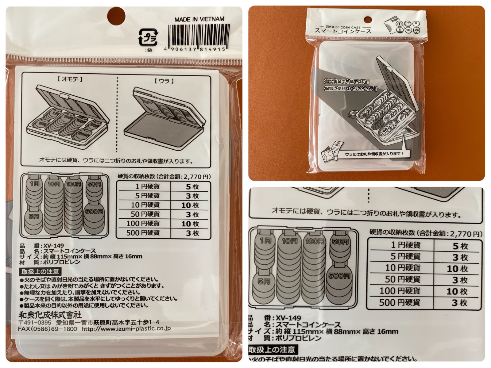 100円・10円が10枚収納でき、全部で2,770円収納できます。