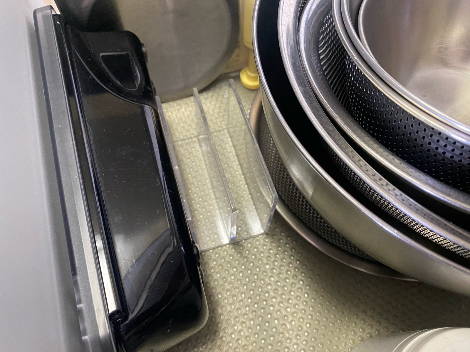 上の様に、100均の仕切りを使ってスライサーや大根おろし器が倒れるのを防止しして、使っていました。