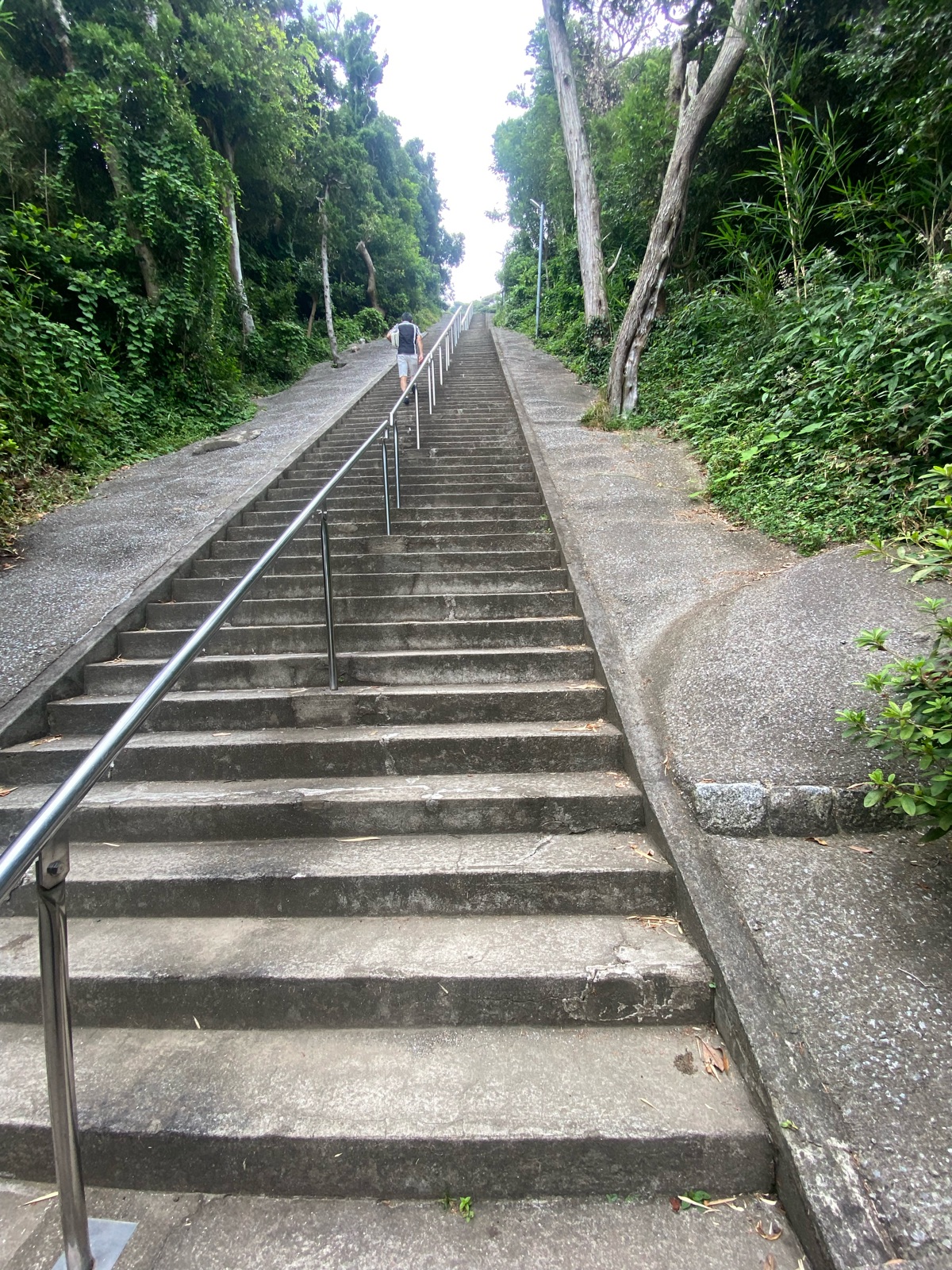 下から150段の階段を見上げると、天気で陽射しが強い日だと辞めたかも?ってくらいに、階段は