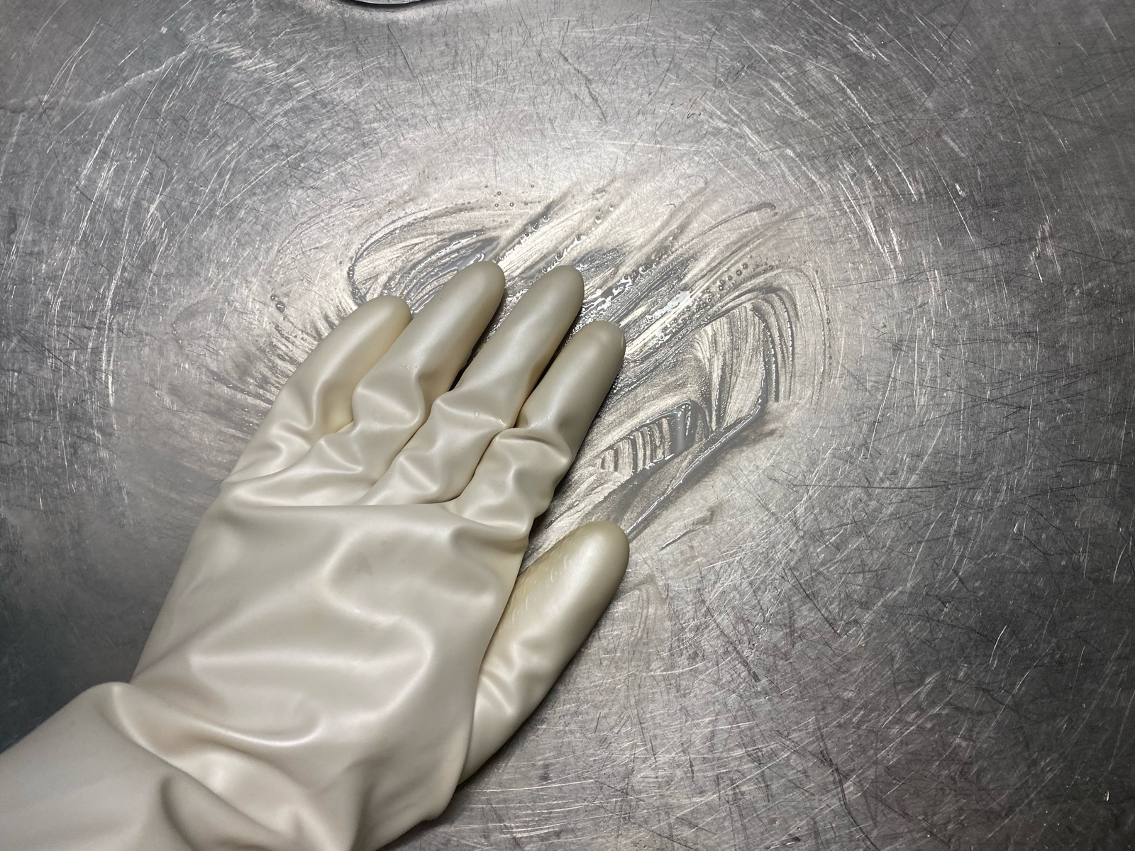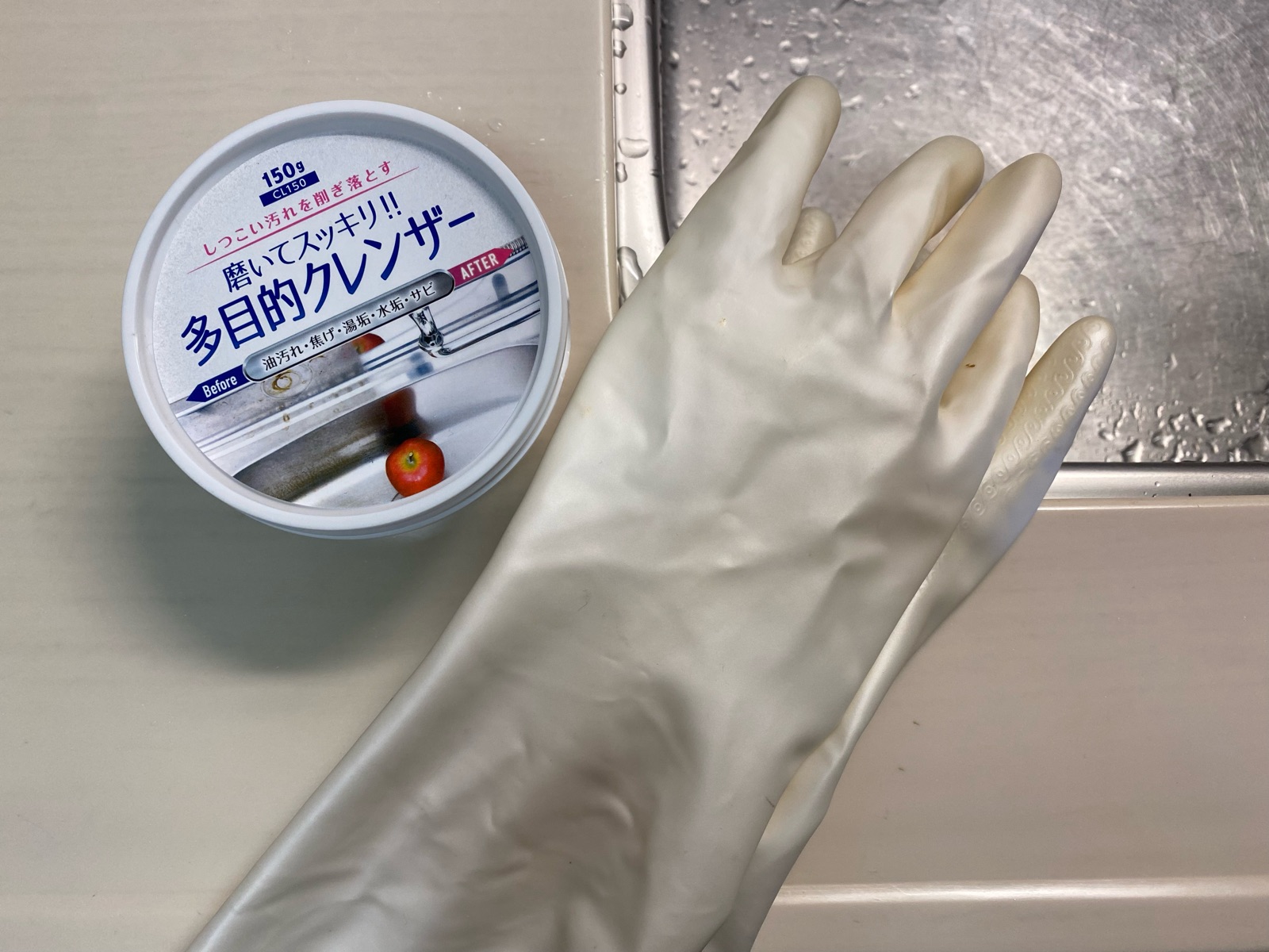 多目的クレンザーを少量取り出し、手袋をはめてシンクを擦り洗い。