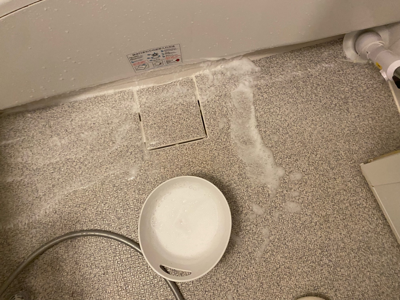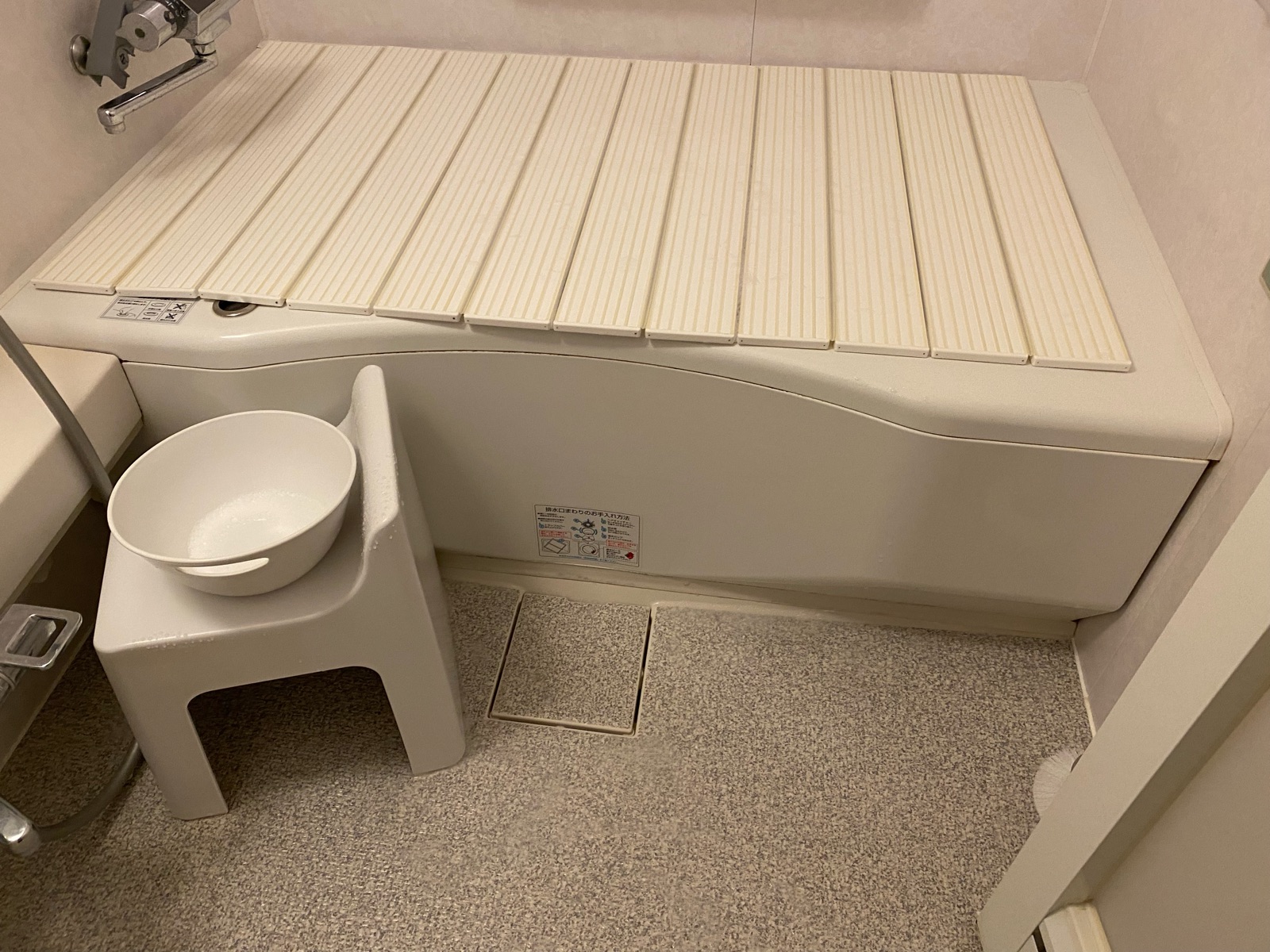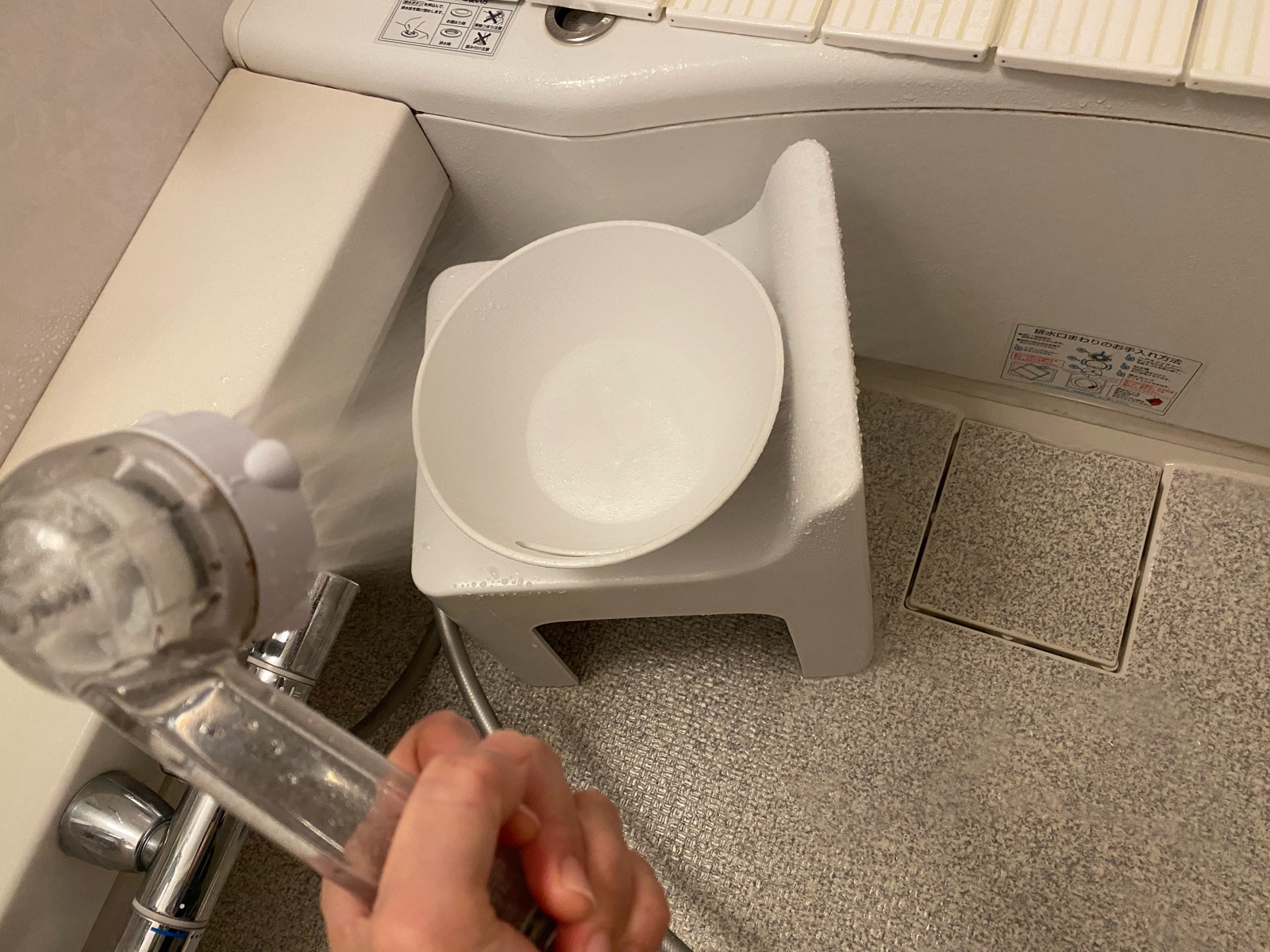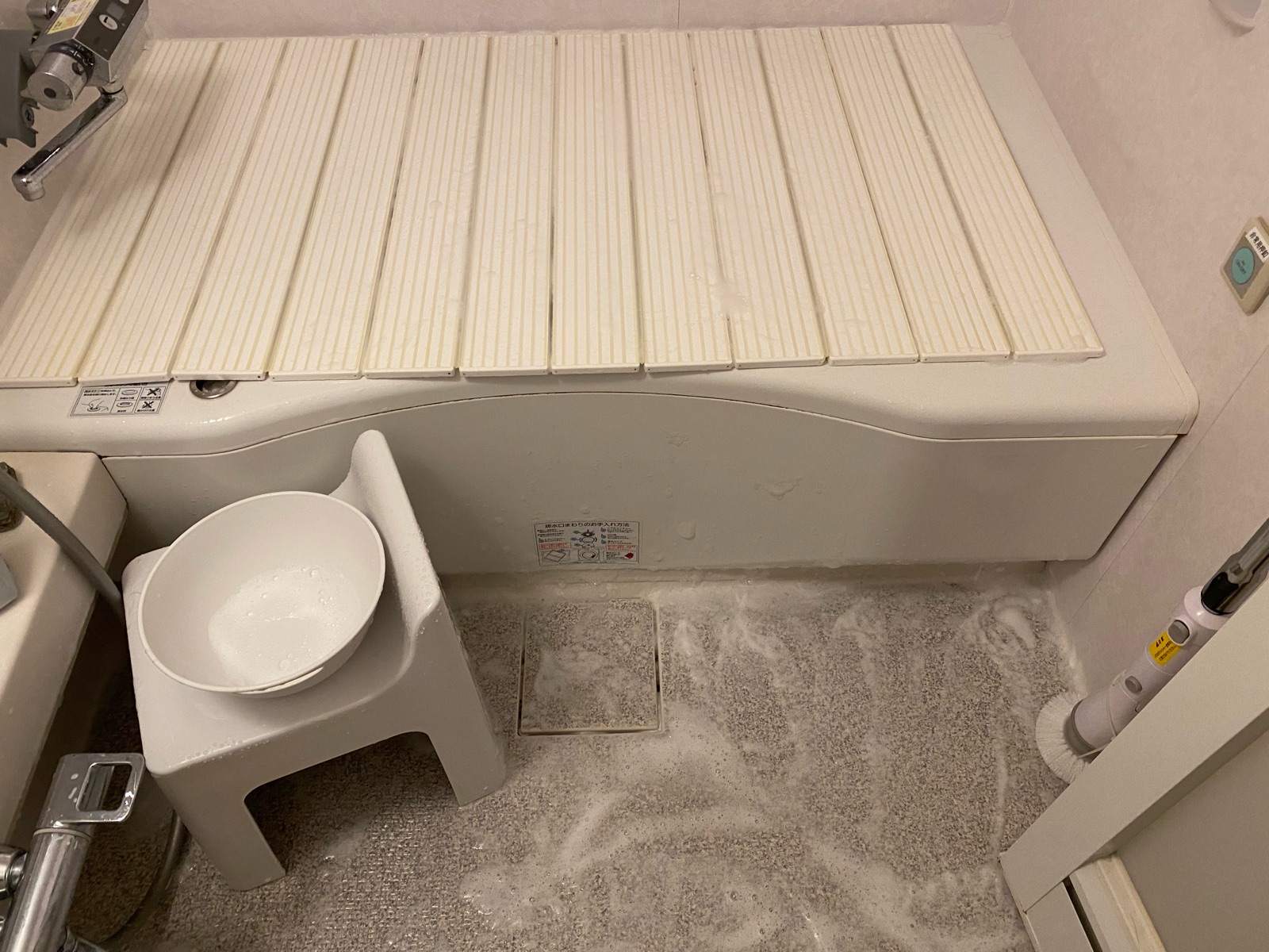 浴室の床だけじゃなく、風呂蓋やイスも泡を塗り広げた状態で30分ほど放置。