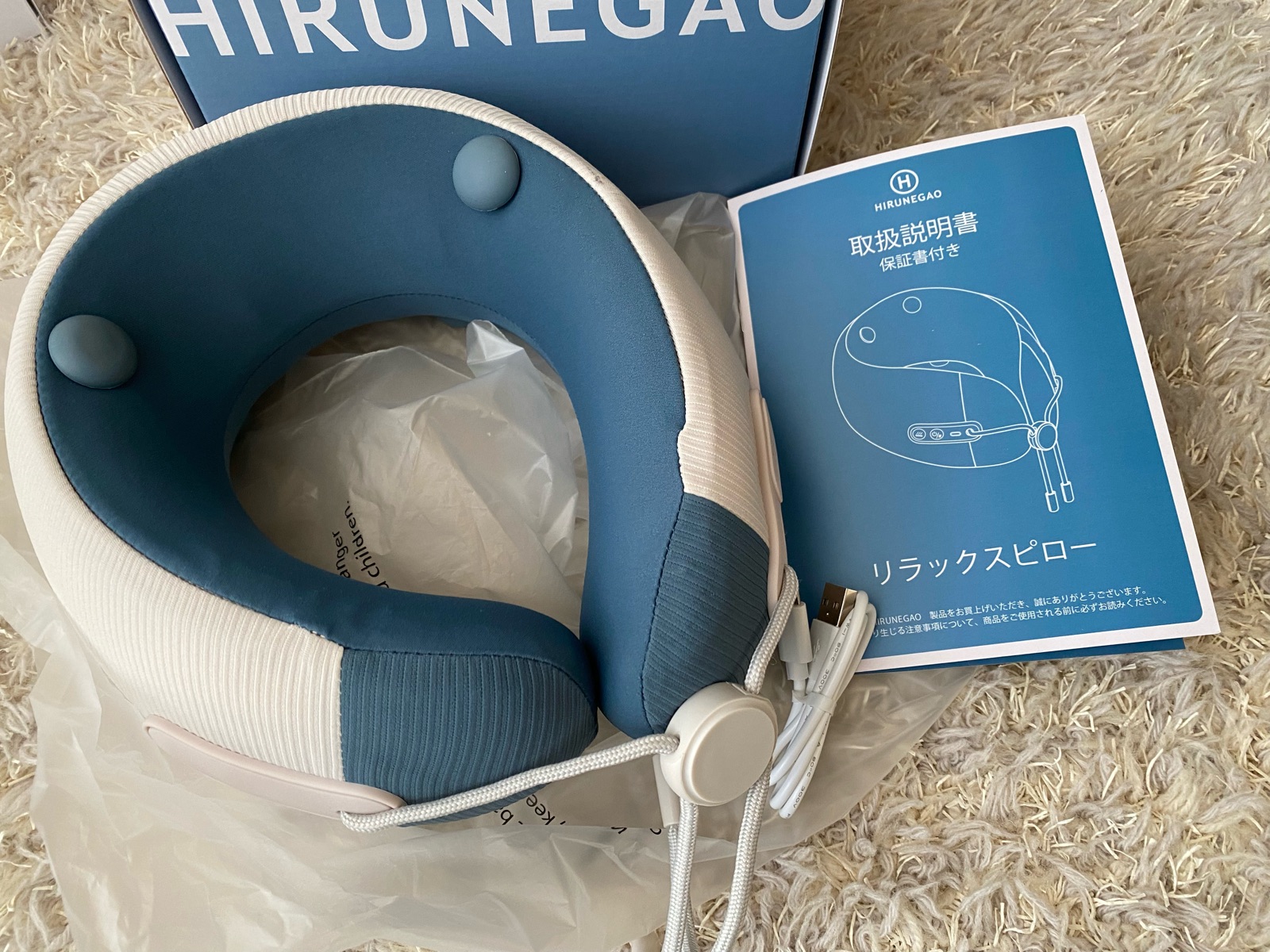 中から出てきたのは、「リラックスピロー」本体と充電用USBケーブル、取扱い説明書