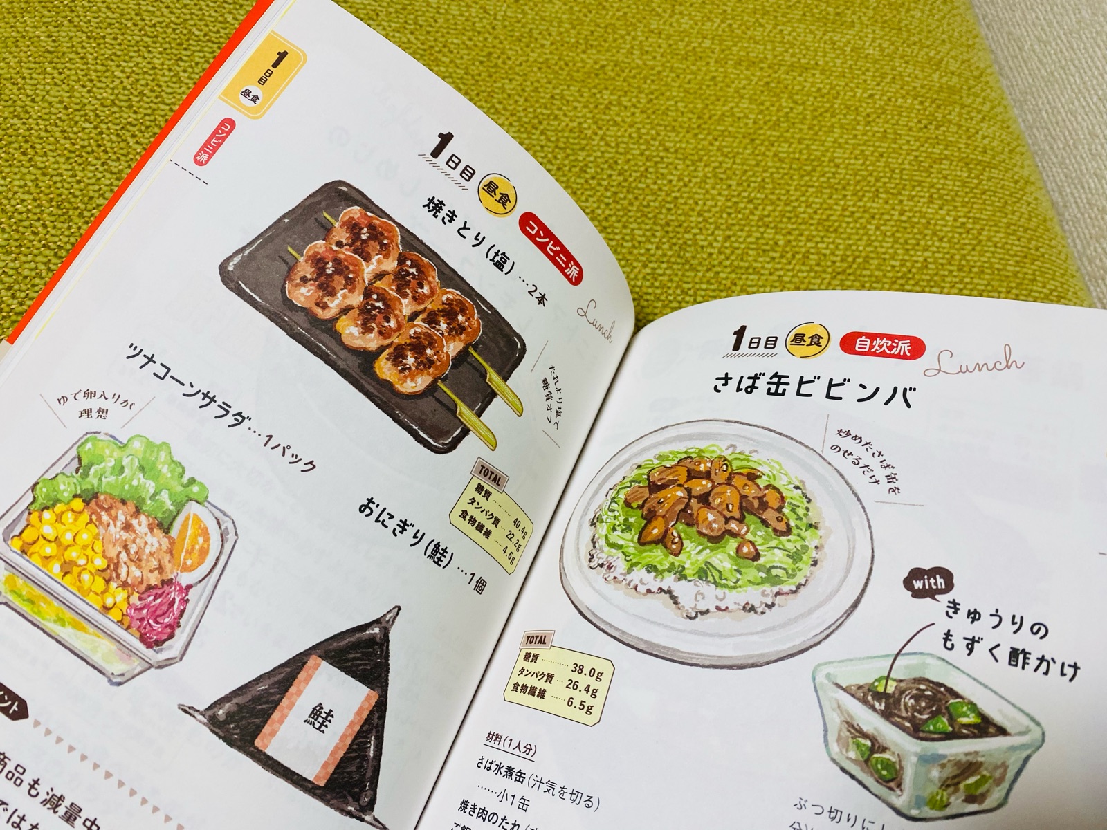 コンビニで買って食べるコンビニ派。カット野菜や缶詰など簡単調理の自炊派の両方が記載されていて、外食する時のポイントなども分かりやすくイラストで描かれていて