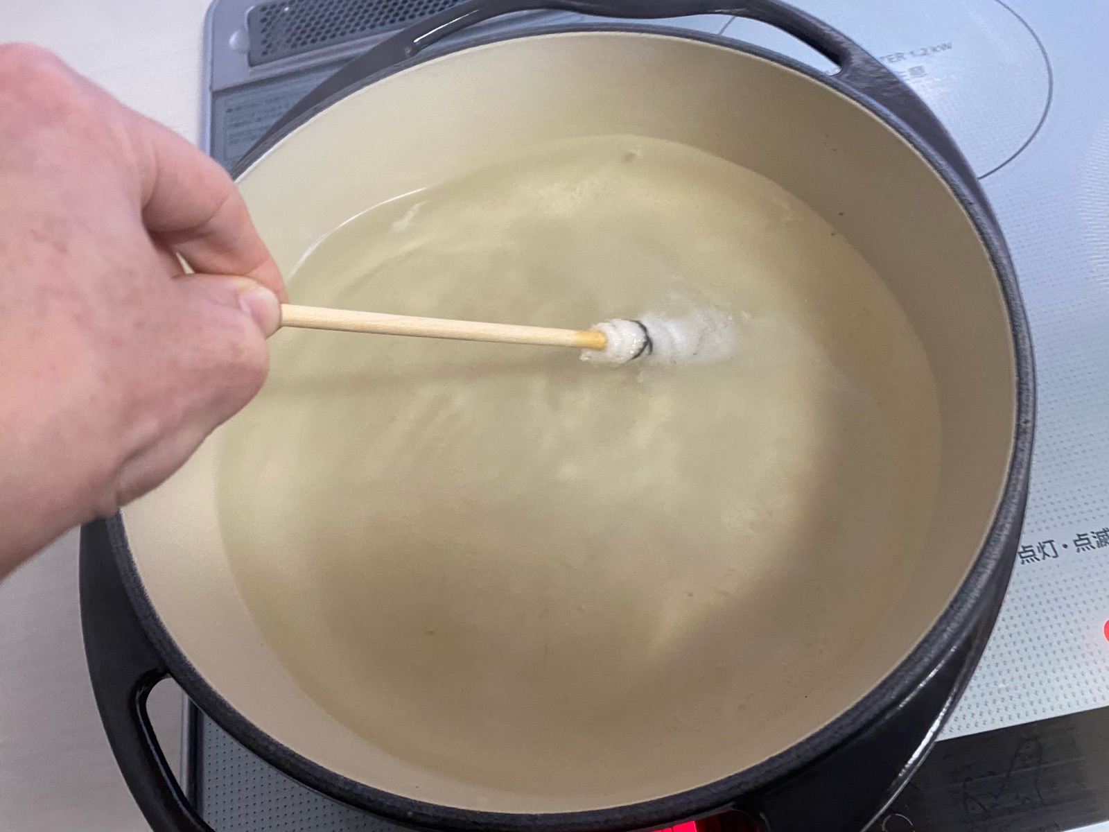 お湯が沸いてきたら「松井棒」で焦げあとの所を軽く擦ると