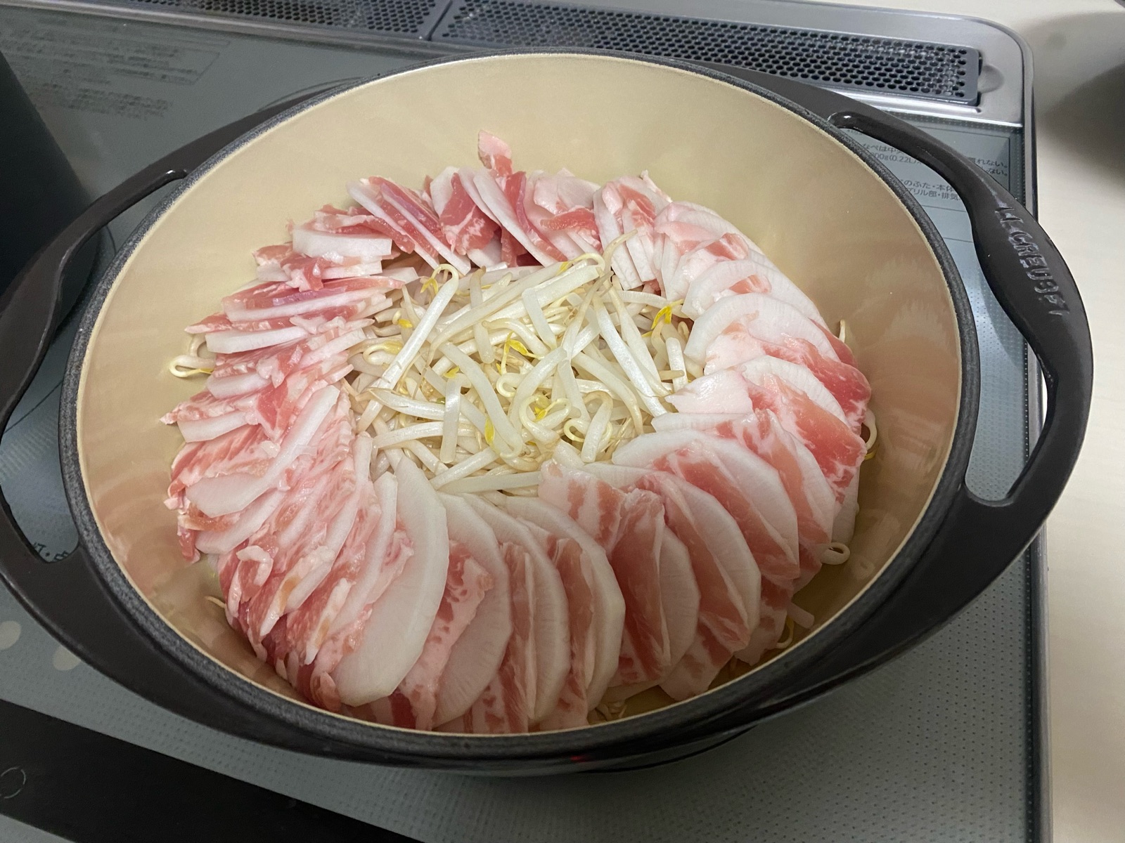 豚バラを大根に挟んで真ん中には「もやし」を入れてお鍋にしたら・・
