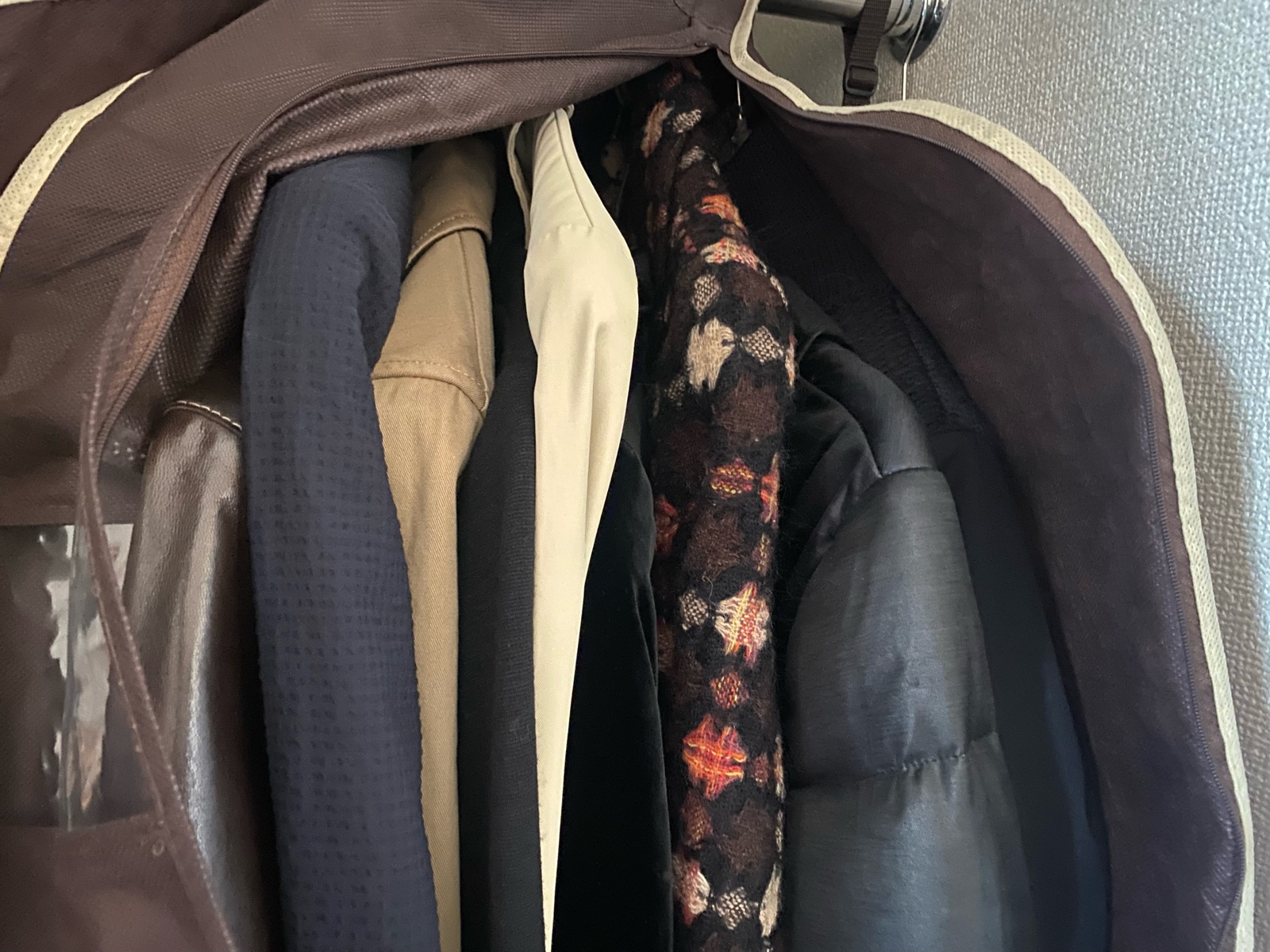 カバーの中では左側が春・秋物で右側が今の季節の服と収納していき