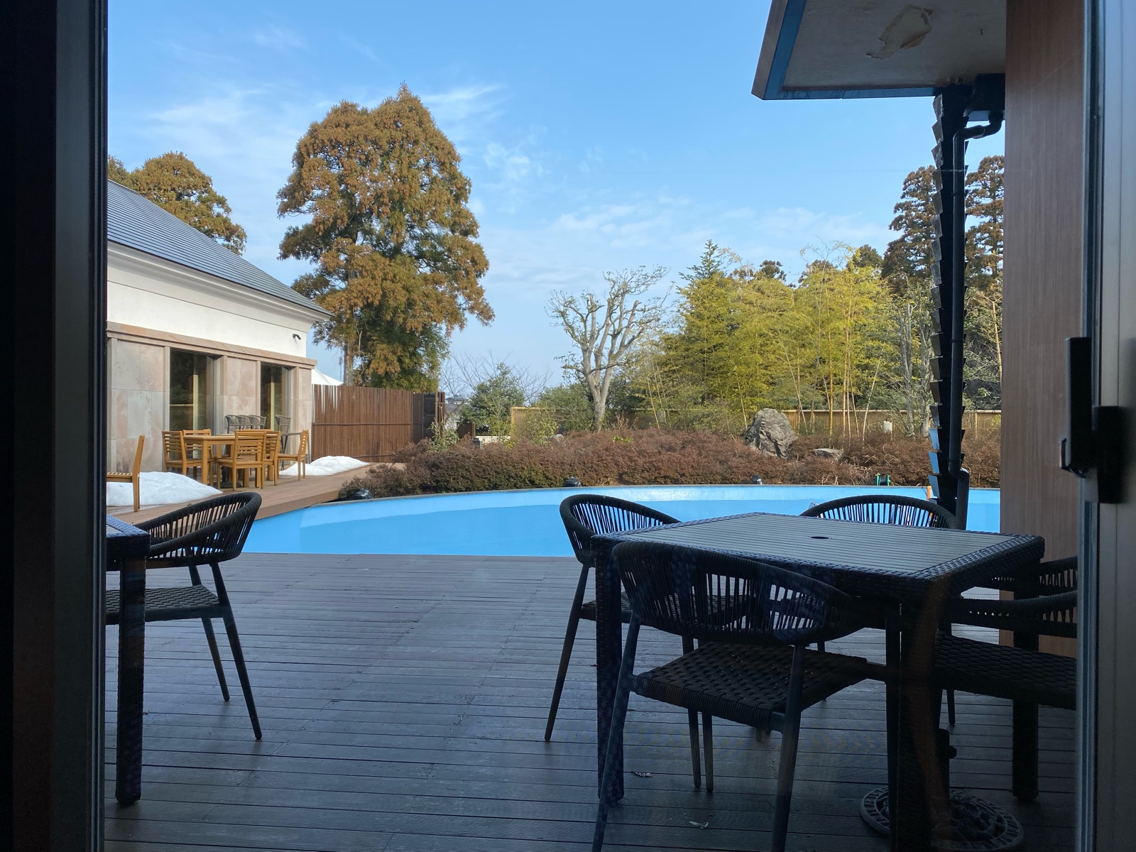 晩ごはんの時は真っ暗でわからなかったけど、テーブルの横はプールでした。