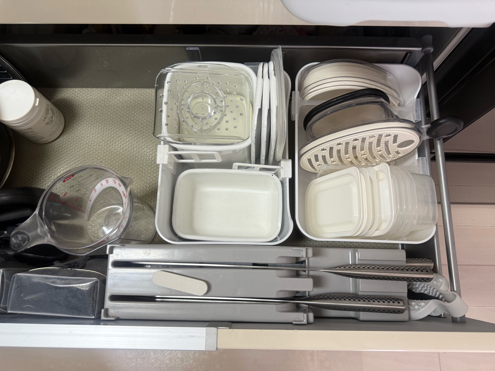 また、100円ショップの仕切りを使って保存容器やおろし器などを収納して