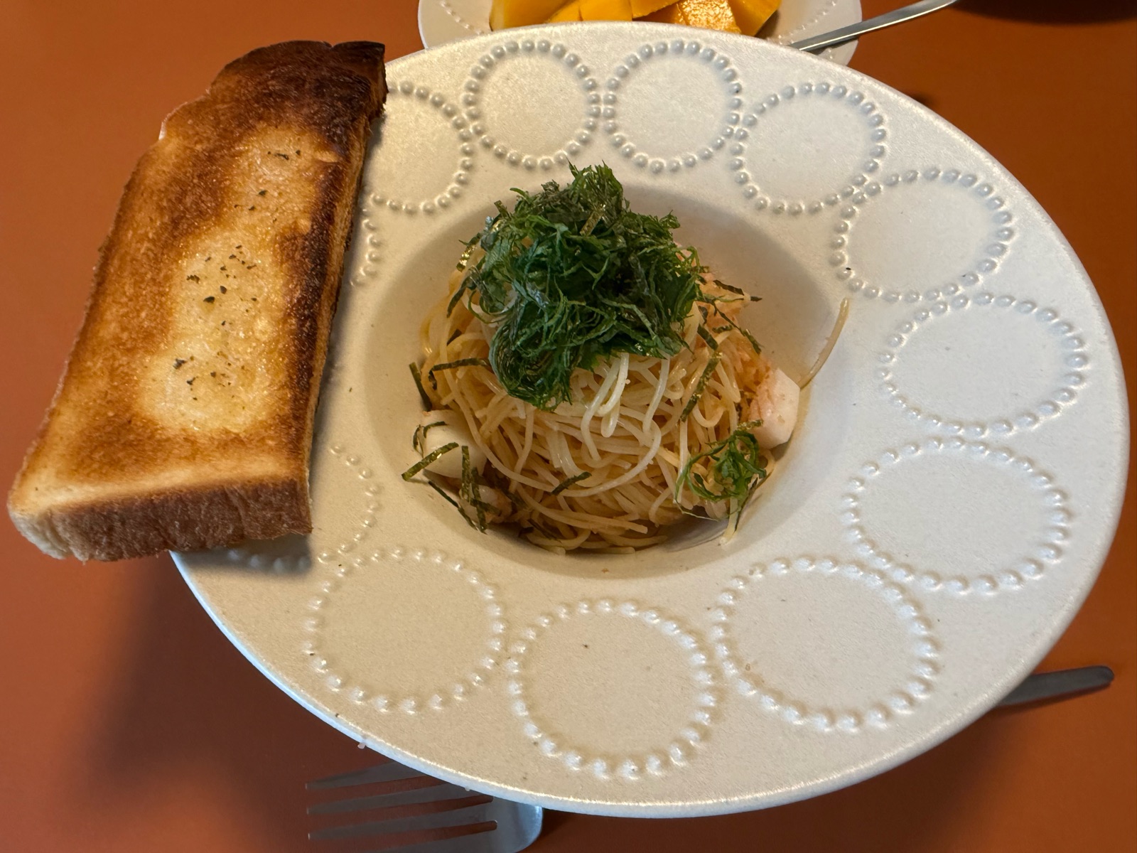 明太子スパゲティとトリュフバターをのせて焼いたトースト添えに