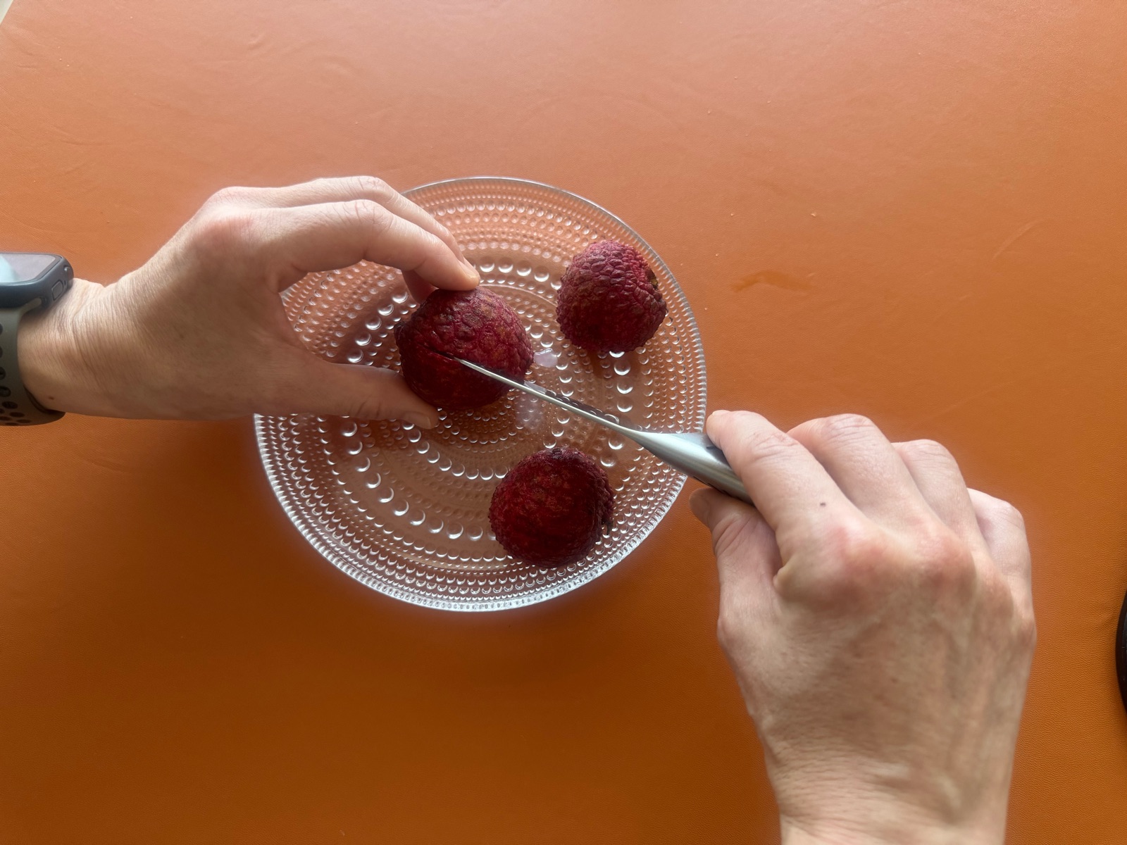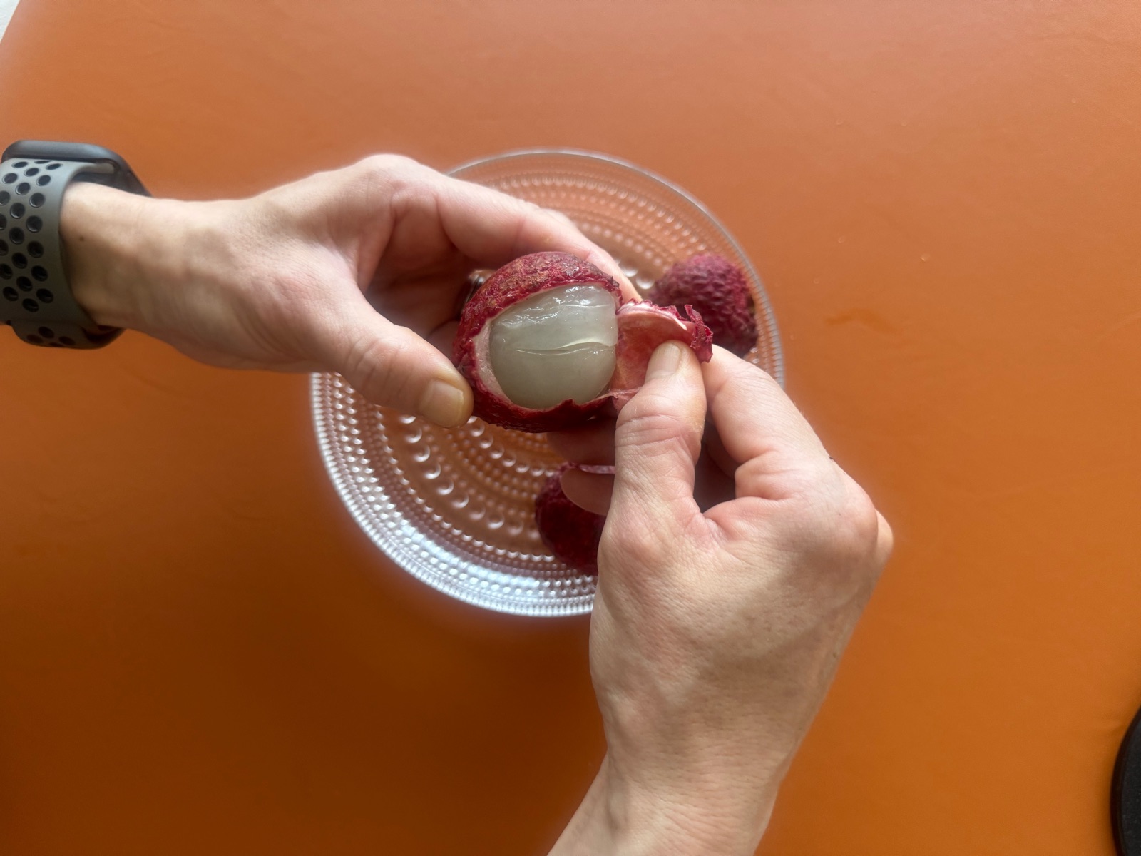 皮をむくと驚くほどたっぷりの果汁があふれだし、ライチの良い香りが広がります。