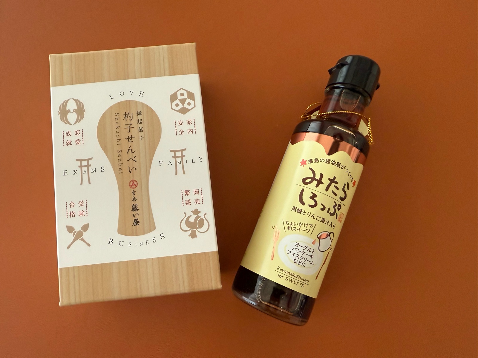 もみじ饅頭で有名な「藤い屋」の杓子せんべいと「みたらシロップ」