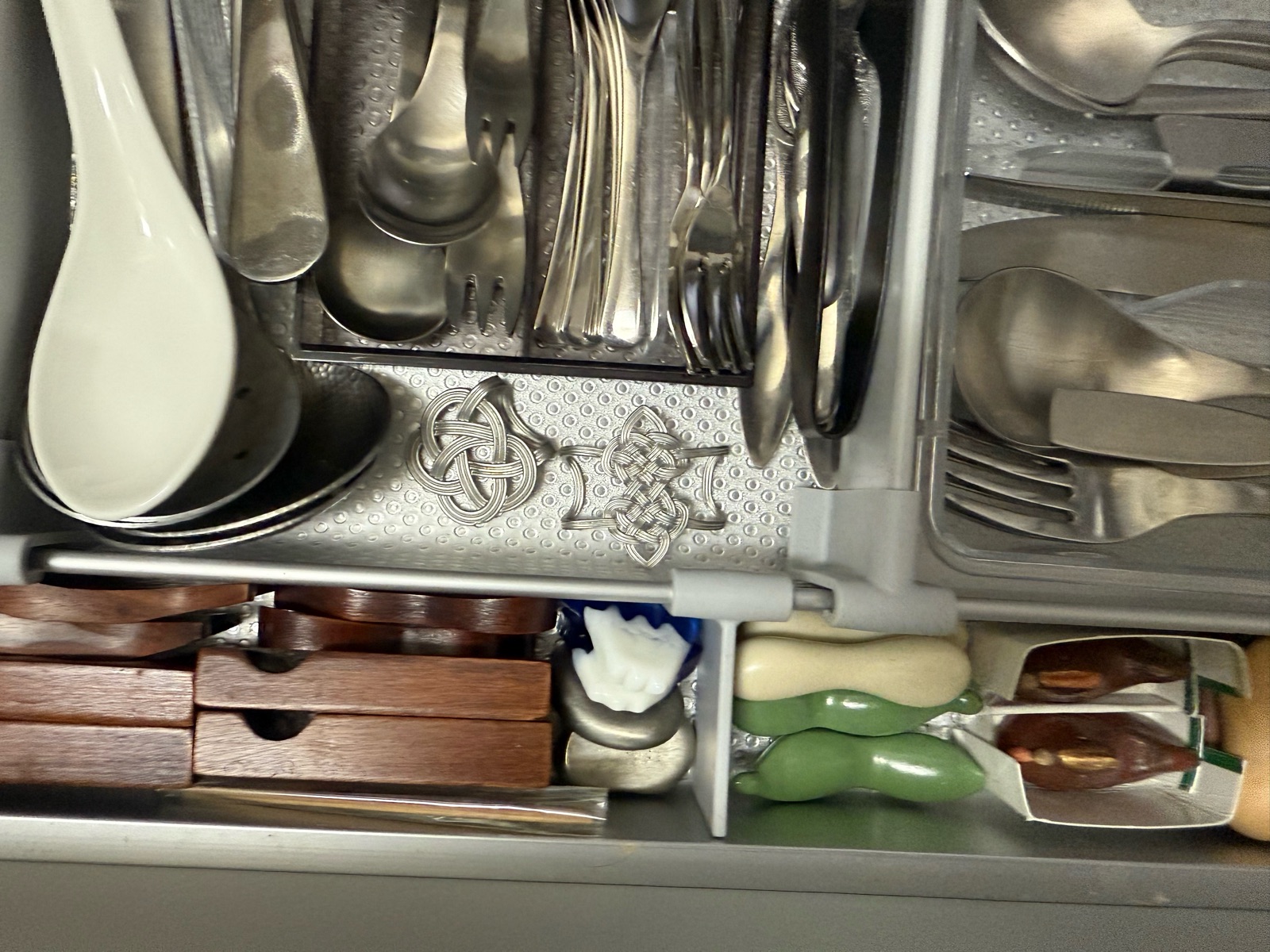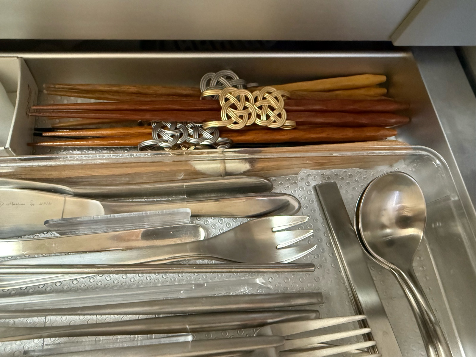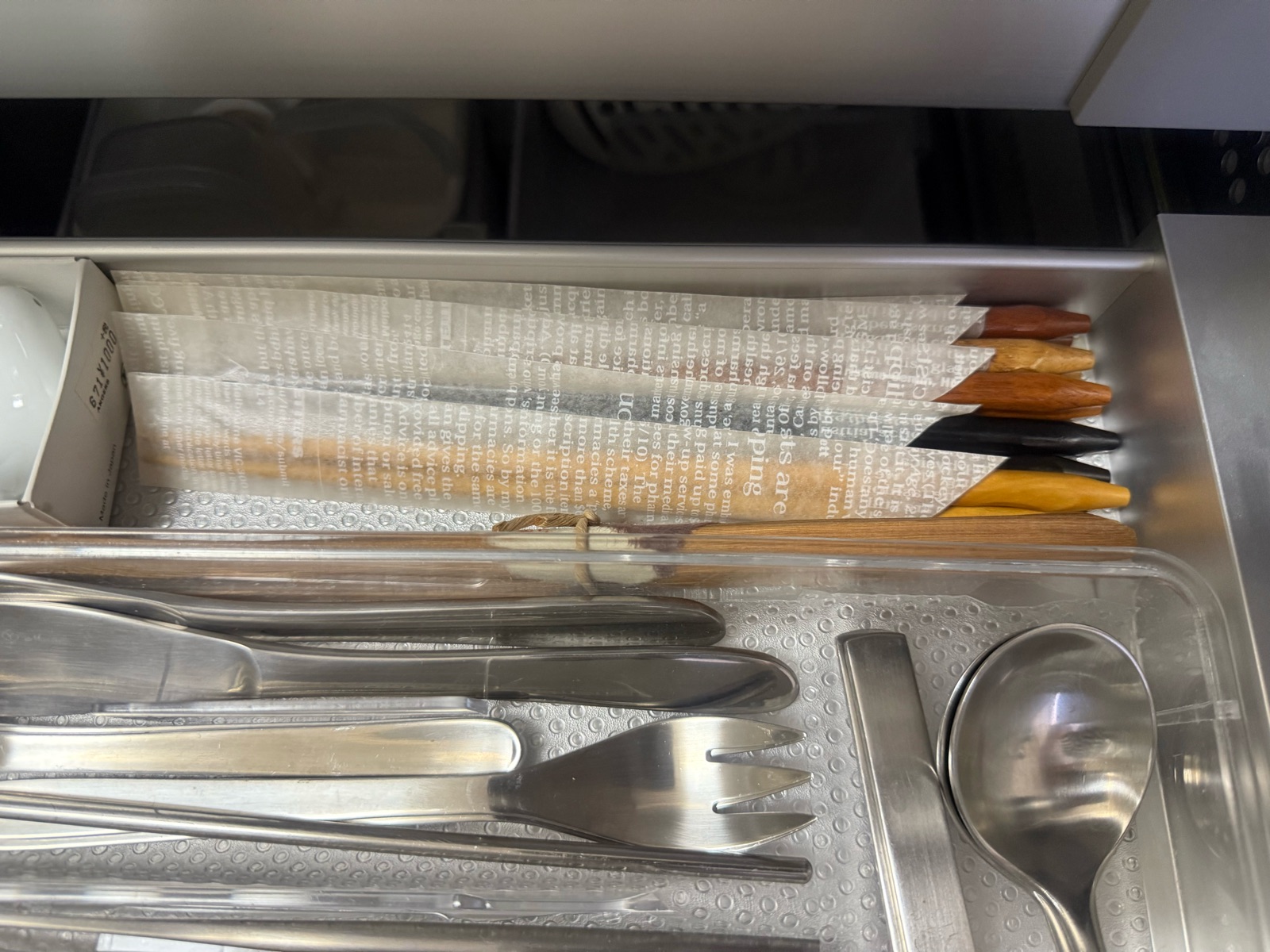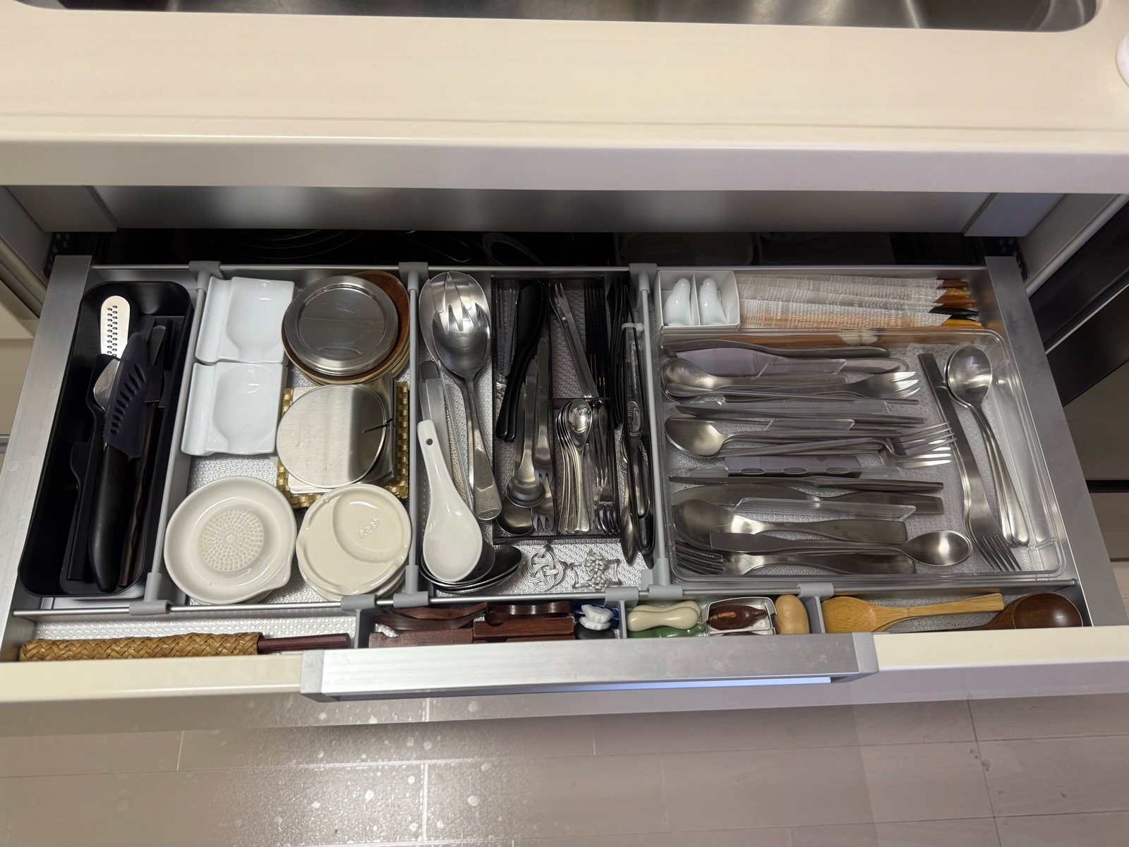 キッチンシンク下の高さが低い引き出しにカトラリーを収納しており