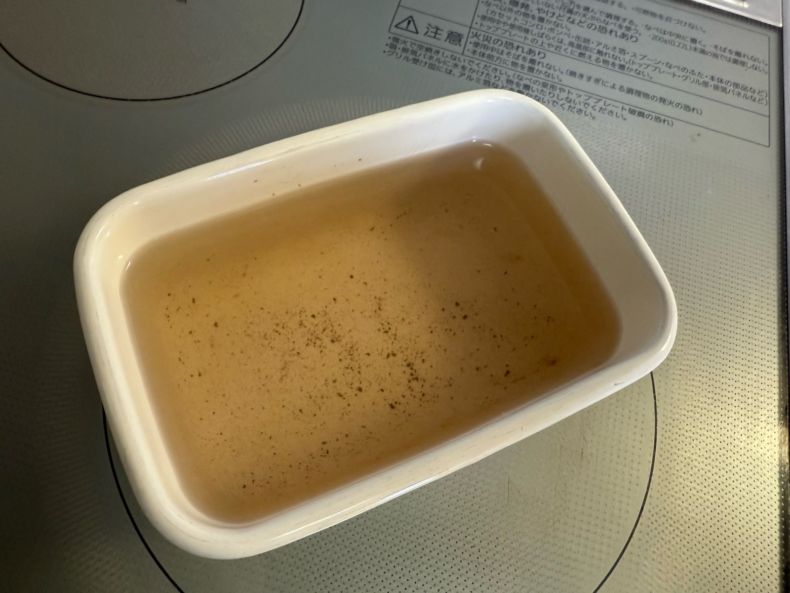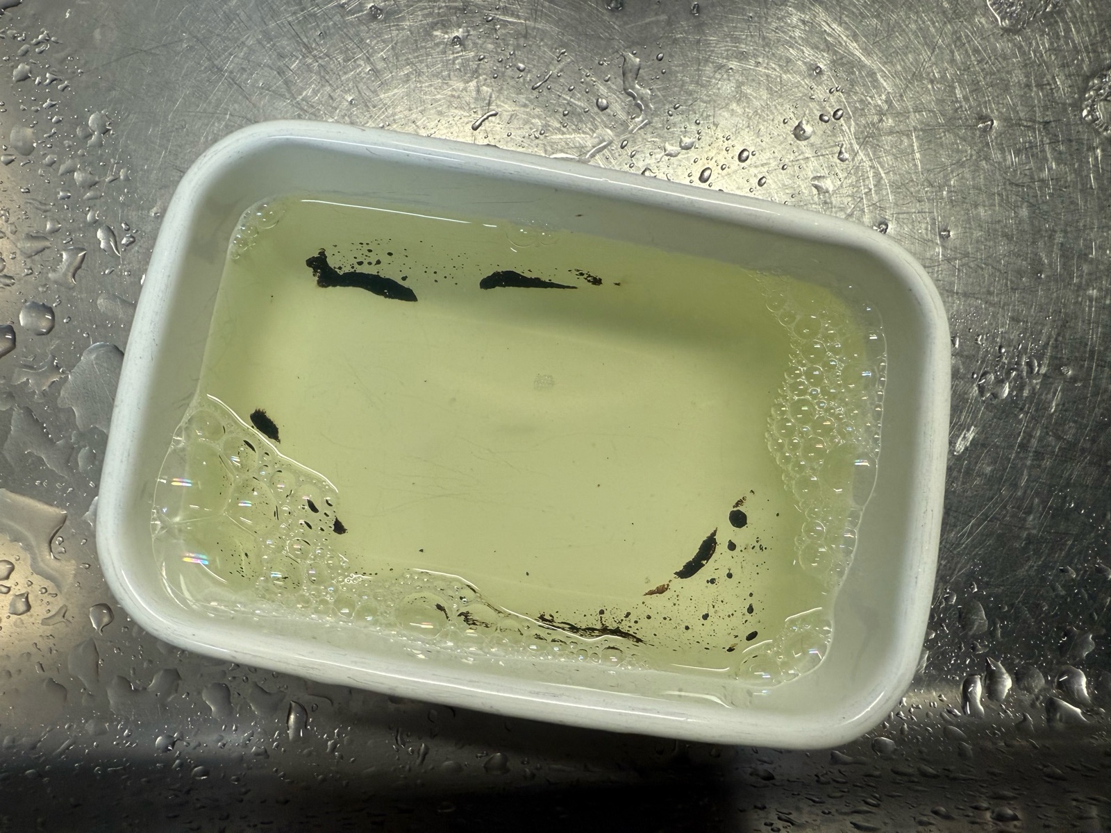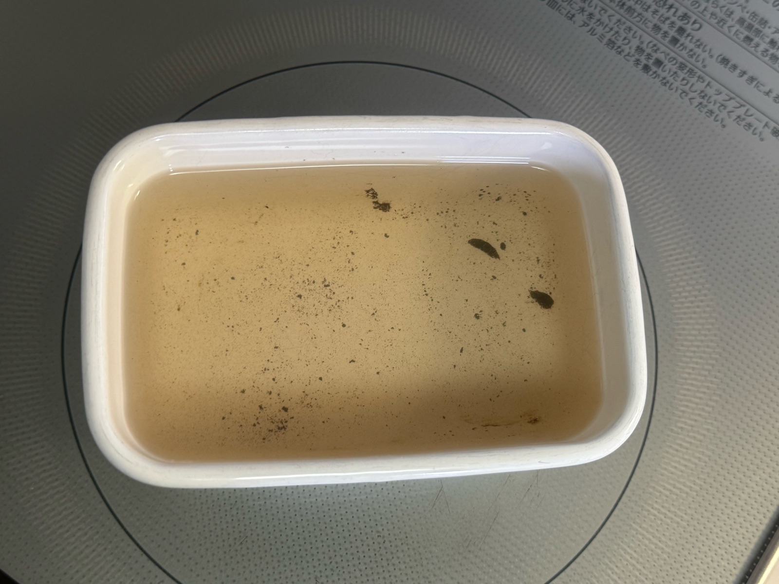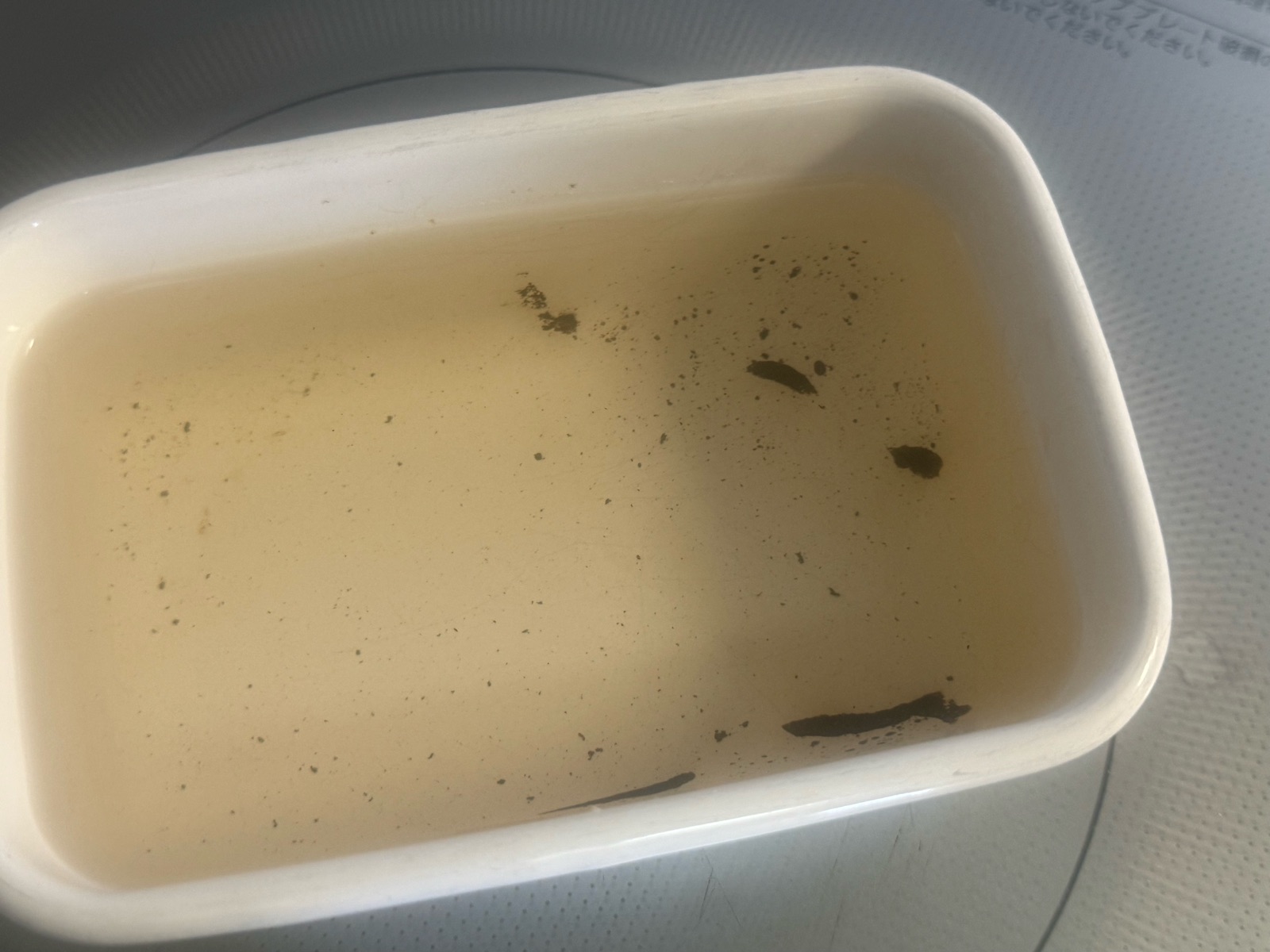 水と台所洗剤を入れた物で一晩漬け置きしたら取れる?と放置してみましたが