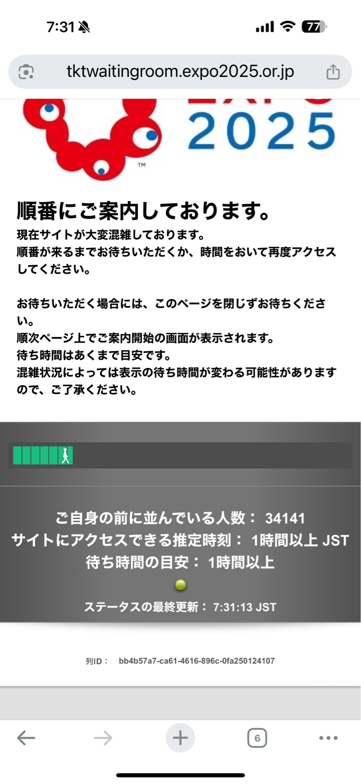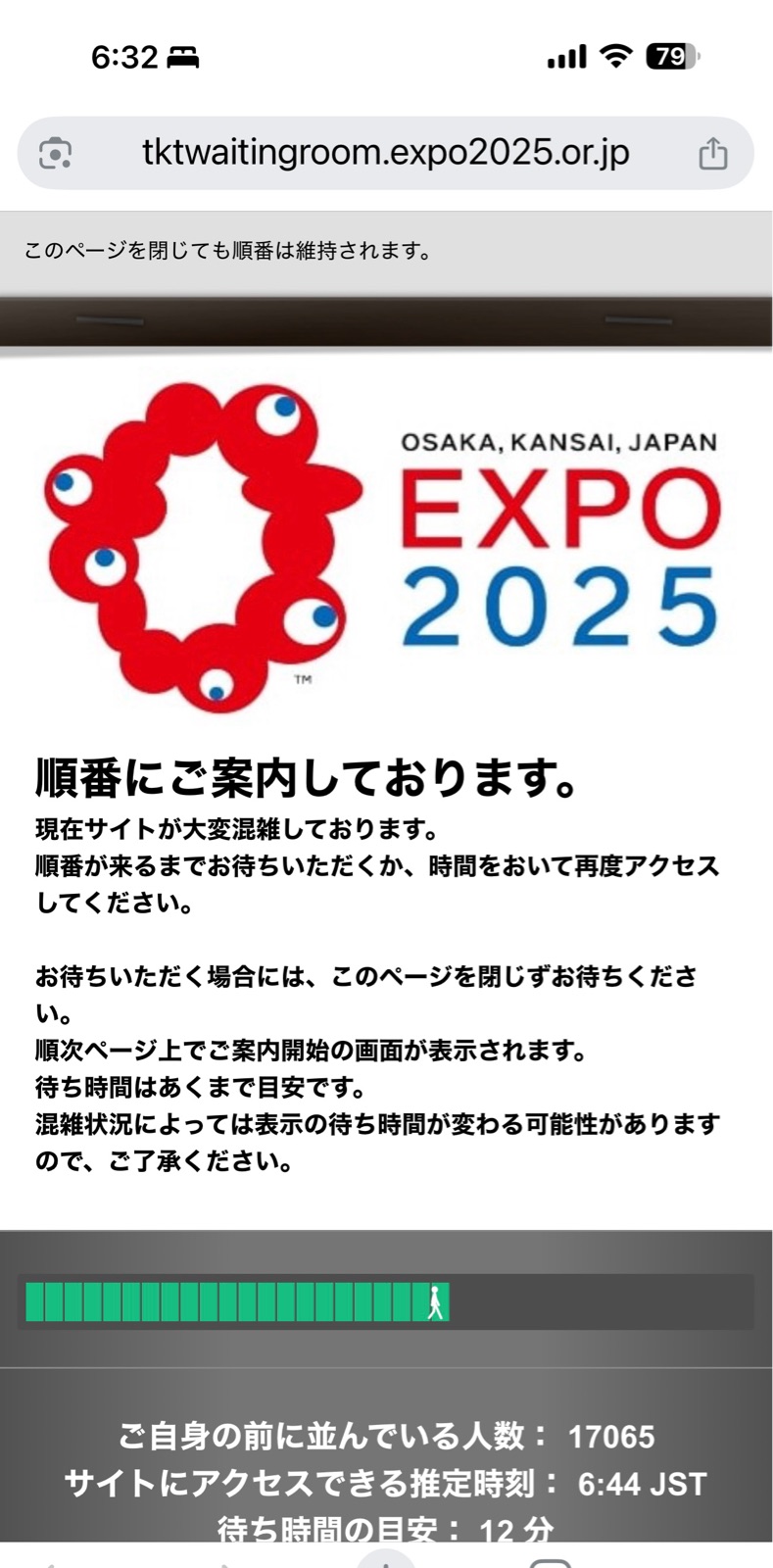 万博アプリに接続するまでの待ち時間が2時間以上と表示され