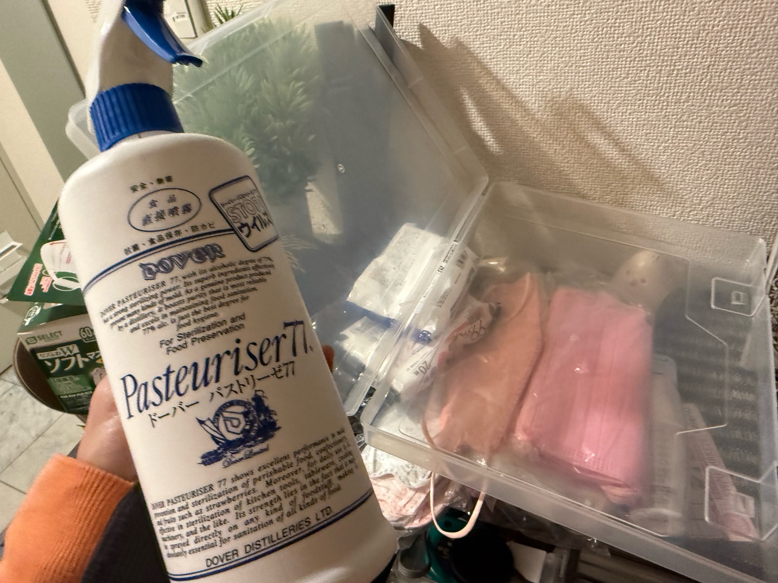 手前のスプレーは消毒スプレーや主人の花粉ガード系のスプレー。