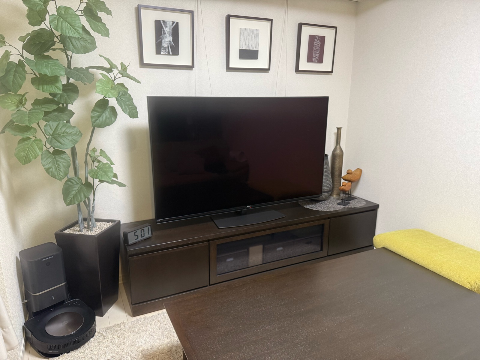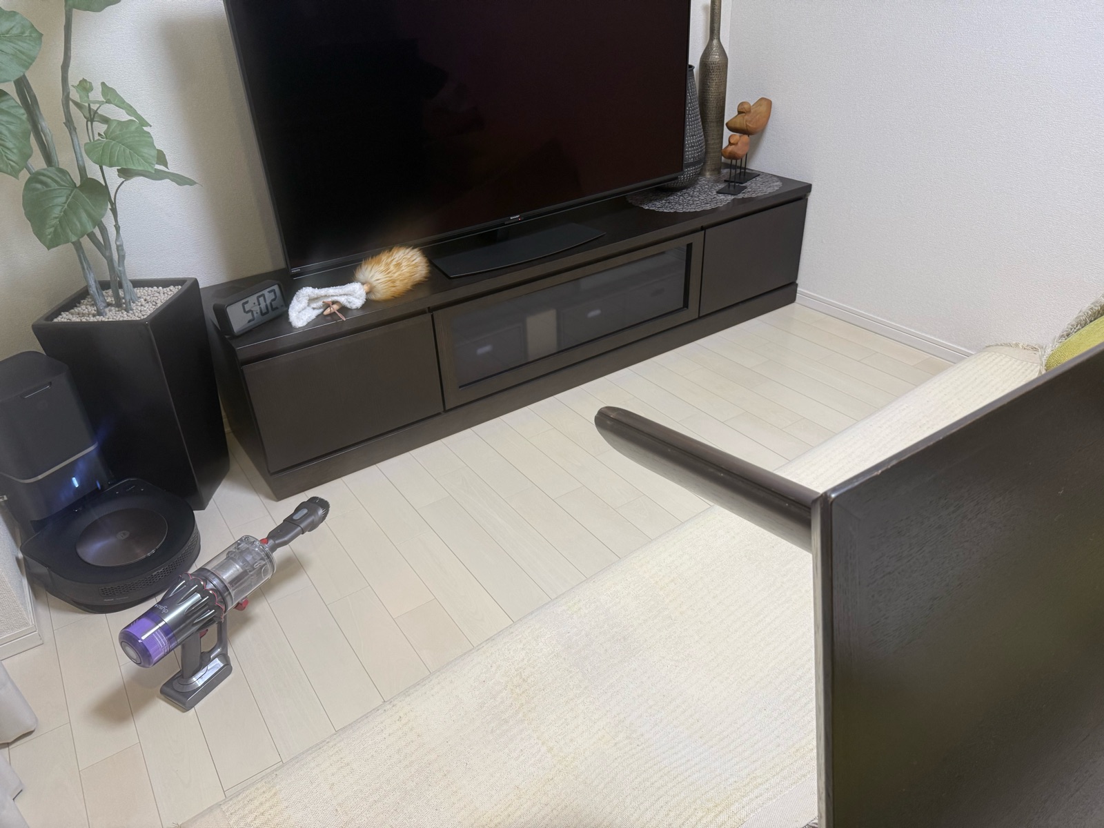 テレビボードの裏側や、横に置いているフェイクグリーンまで掃除して、