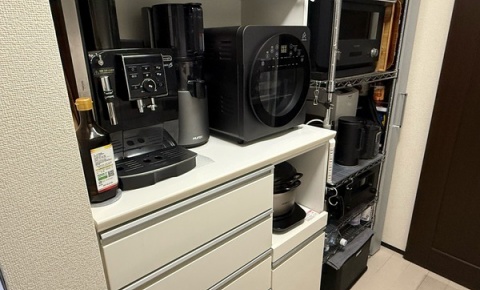 こんにちは。キッチン背面に設置しているキッチンボードにはエスプレッソマシーン他調理家電を並べて置いています。抗菌消臭滑り止めシート(KB001) ニトリ 【玄関先迄納品】エスプレッソマシーン。コーヒーを淹れる時にも少々飛び散る事があるので汚れ防止にニトリの食器棚