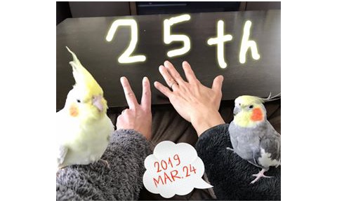 今日は、まめ嫁夫婦の結婚記念日♪オカメ'sが2羽揃って撮れたキセキの1枚。早いモノで、もう25年。「銀婚式」を迎えました。まめ嫁「銀は要らんから同じシルバーに光る”プラチナ”の何か買って♪」主人 ( ̄m ̄〃)ぷっ!鼻で笑われて終わりました。25年も経つとこんなモノで